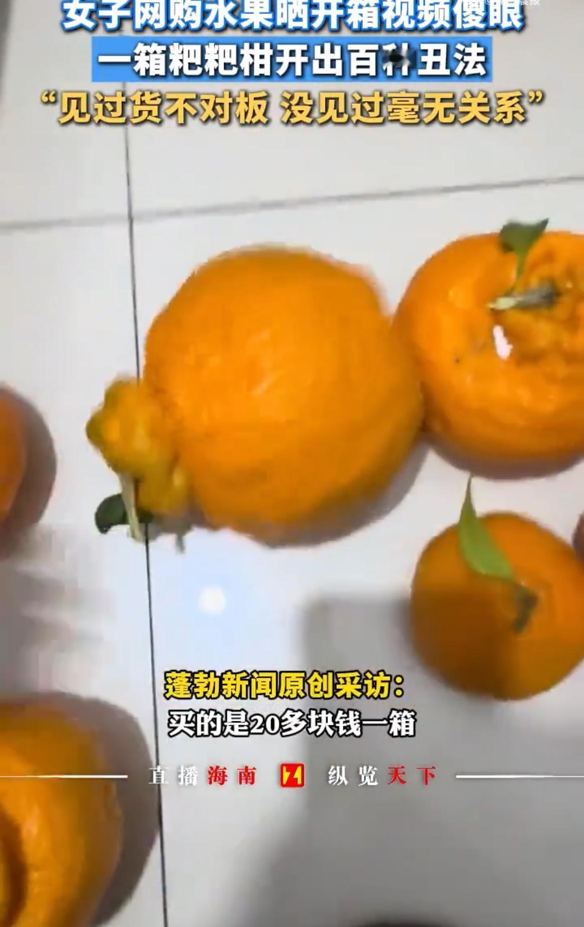 网购一箱粑粑柑,拆开懵了:这哪是水果?简直是“丑橘博览会”! 昨天刷到个视频,一姐妹兴冲冲拆开网购的粑粑柑,结果直接傻眼。箱子一开,好家伙,真是“百丑争艳”——大的大、小的小,最小的跟冬枣似的,还有的坑坑洼洼像月球表面。网友笑疯了:这哪是水果箱,分明是丑橘艺术展,每个都丑得独一无二! 我仔细一看,这哪是春见耙耙柑啊?宣传说皮薄肉厚,结果发来的全是表皮粗糙、凸起扎手的“不知火”丑橘。俩品种成熟期差俩月,价钱也差一截,商家这波操作属实是“挂羊头卖狗肉”了。 幸好这姐妹机灵,拍视频直接怼上网。商家一看势头不对,24小时内就赔了款。算他们识相,不然这届网友可不好糊弄,热搜词条都预备好了:“丑得各有千秋”“抽象派水果”,调侃归调侃,大家心里都清楚:这哪是搞笑,根本是消费陷阱! 说真的,现在网购水果就像开盲盒。宣传图光鲜亮丽,到手可能“丑哭你”。我倒不是嫌弃果子长得怪——自家种的也有歪瓜裂枣。但你不能拿便宜品种冒充贵的,还专挑“丑中极品”发货吧?这是把消费者当傻子忽悠。 这事也给咱提了个醒:下次网购生鲜,别光看卖家秀。多翻翻带图差评,收货立马开箱验货。遇到这种货不对板的,别嫌麻烦,该拍视频拍视频,该维权维权。咱花钱是为了吃甜果子,可不是为了收集“丑橘图鉴”的! 你们网购水果踩过雷吗?评论区聊聊,给大家避个坑!