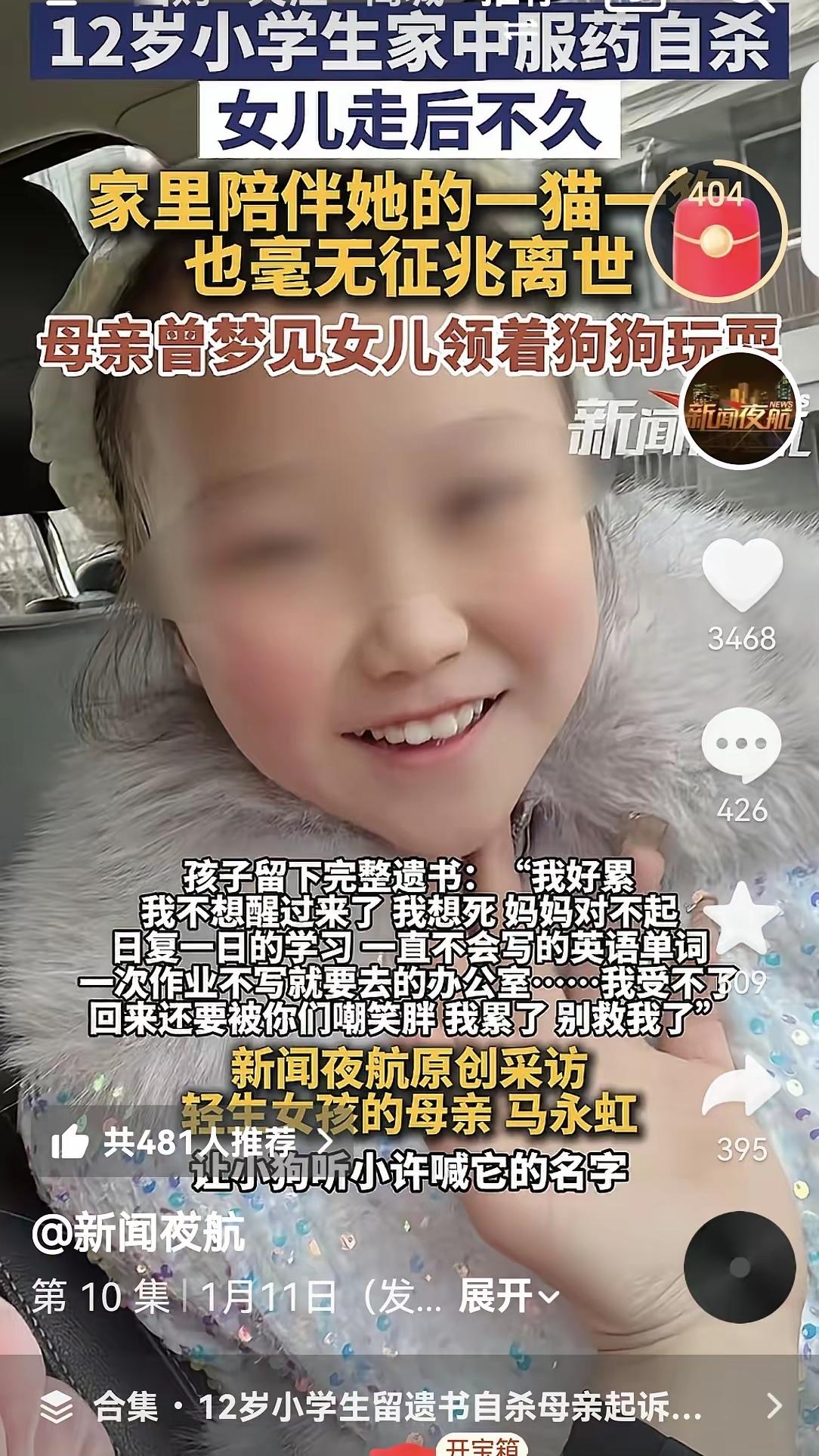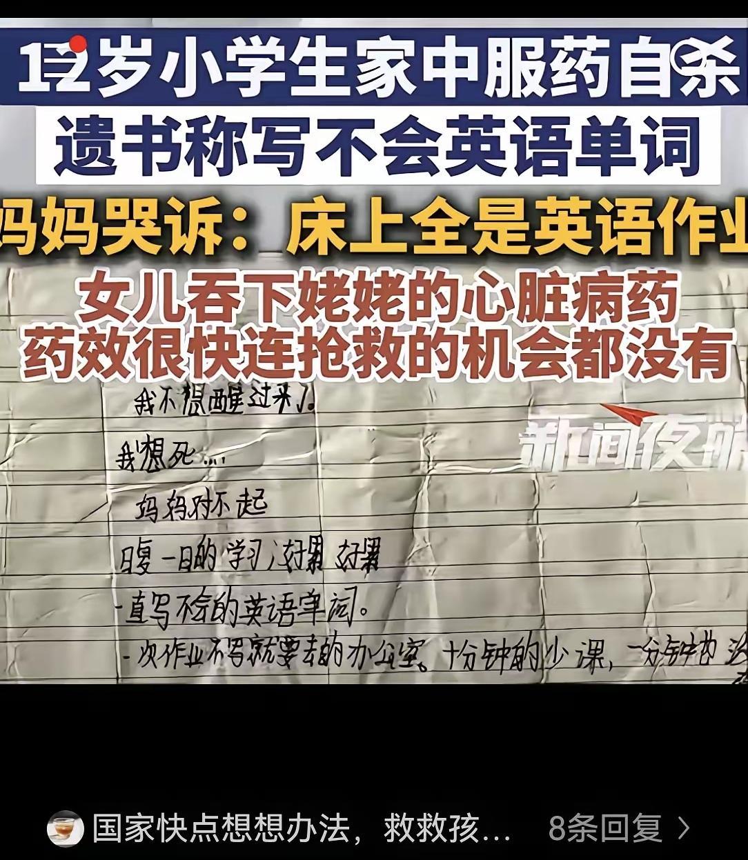 “这样的悲剧什么时候才能没有呢!” 12岁女孩服药自杀,母亲不反思,反而告英语老师,不理解。 从孩子的遗书中可知,小女孩的在学习方面压力大,回家还被最亲的家人嘲笑她胖,双重压垮了孩子求生之路。 只能寄希望,国家出手减负孩子的作业学习重压,让孩子们尽可能的轻松学习,不是被给永远做不完的作业压垮。 父母的视角:孩子在学校作业已经够他们做了,不要在买各科目的习题,报各种课外班,逼孩子卷。 老师视角:作为负责任的老师,被父母投诉对孩子太严肃。要是不管孩子,也会被投诉,对孩子不上心。 老师只要不是恶意虐待孩子,孩子遇到困难,叫到办公室询问孩子学习困难这样的事情,真的算得上小事情吧! 社会发展至今,90年代自己经历的学习期,背诵课文背不下来,被老师留堂,什么时候背下来,什么时候可以回家吃饭,当然实在背不下,也会让天黑前回家。 这些对这个年代的人来说,正常不过。 不知道,为何现在变成老师不敢负责,父母承担了老师的一半责任,父母非要自己孩子卷起来,生怕落后了! 之前听同事说:她女儿,是自己要求去报补习班,她怕孩子太累了,沟通一番,她女儿告诉她:妈妈,这个在我承受范围内,可以去,我到时承受不住压力了我会告诉你的。 当时听她说时,想着父母和孩子有良好沟通,真好。这样孩子不会有压力,她们可以自己选择。 只能寄希望,这个小女孩的事件能警醒更多父母,让他们把孩子健康放在第一位吧!