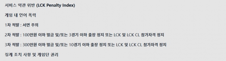 而根据内容显示,在游戏中使用语言暴力,首次查获将被书面警告;第二次查获将被处以100万韩元以下罚款及/或3场以下停赛,或取消LCK及LCKCL参赛资格;第三次查获将被处以300万韩元以下罚款及/或10场以下停赛,或取消LCK及LCKCL参赛资格!