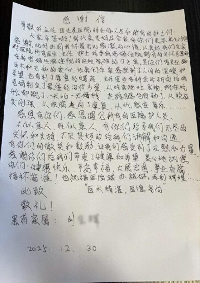 写信人是患者家属刘先生。他的母亲在这里经历了从“吃食物吐食物”到“吃什么都有胃口”,从“软弱”到“刚强”的康复之路。字里行间,是对医护人员无尽的感激,更是对生命重新燃起希望的喜悦。