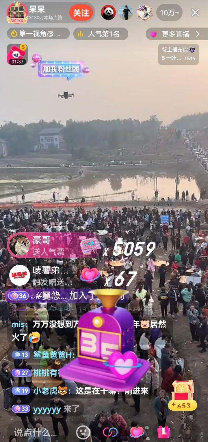 呆呆直播间太火爆了!连无人机也用上了!今天不仅可以吃猪肉,晚上还有篝火晚会!呆呆说,杀了不止2头猪,2头猪肯定不够吃啊!杀了有5头猪!目前呆呆的粉丝已经突破100万了!人气也是排百强榜第一!你说不嫉妒那是假的,多少人拼了命的想红红不了,呆呆只是发了一个求助“按猪”的帖子就爆火!这就是运气吧!运气来了挡也挡不住!
