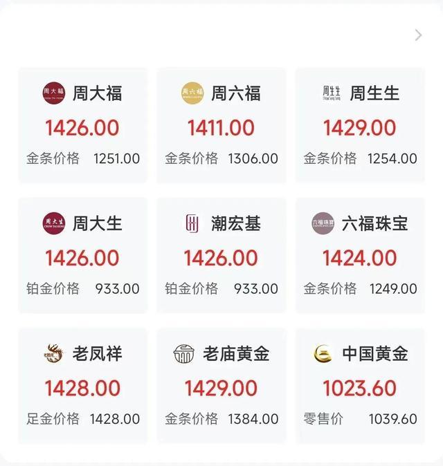 受国际金价带动,国内黄金饰品价格也普遍上涨,多个品牌足金报价突破1400元/克。其中,周生生、老庙报价1429元/克,周大福、周大生报价1426元/克,六福珠宝报价1424元/克,较昨日普遍上涨了20元/克。