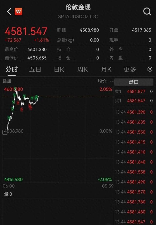 受地缘政治高度不确定影响,美国纽约商品交易所黄金期货价格1月11日创历史新高,一度突破每盎司4612美元。12日早盘,现货黄金强势拉涨,盘中首次突破4600美元,再创新高。截至发稿有所回落,报4581.547美元/盎司。