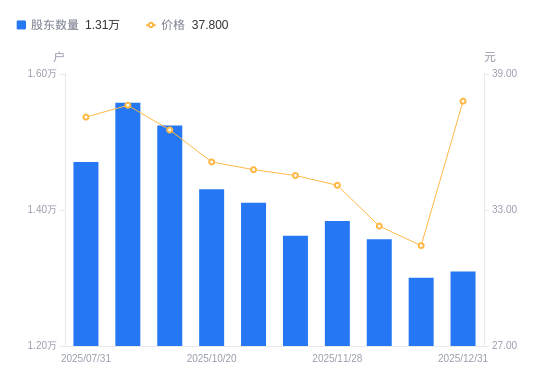 日期A股户数(户)流通A股户均持股数(股)户均持股市值(万元)2025-12-31130946166.0823.312025-12-19130036209.2319.522025-12-10135705949.7919.212025-11-28138375834.9819.892025-11-20136215927.5120.462025-11-10141065723.7119.912025-10-20143053063.8010.762025-09-30152412875.6410.502025-09-19155772813.6110.582025-07-31147052980.4611.06