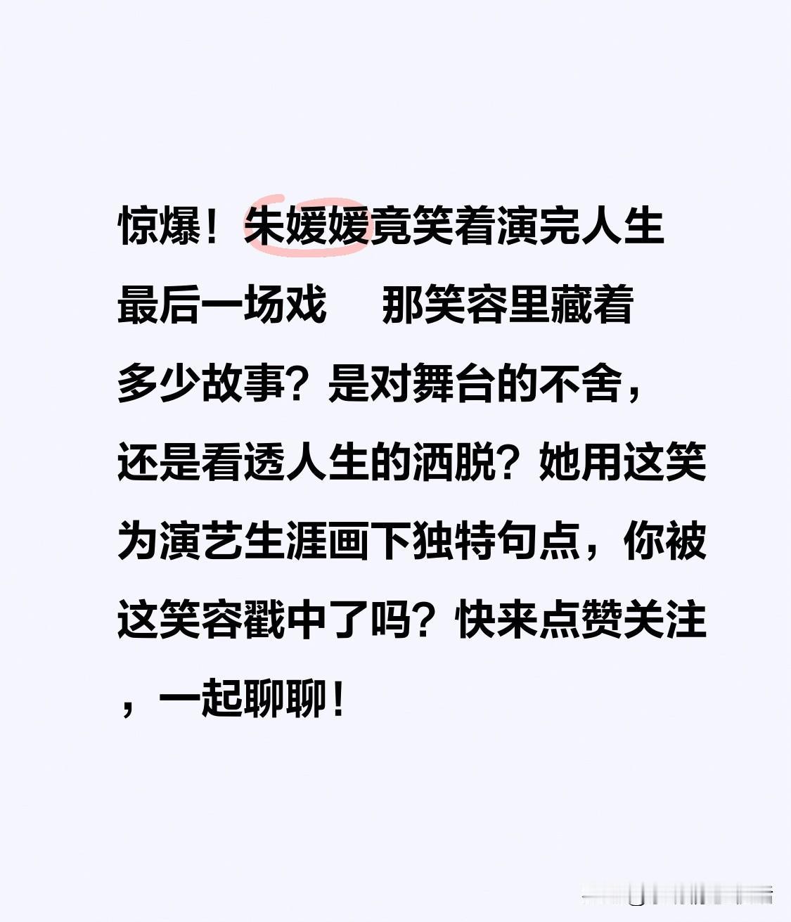 惊爆!朱媛媛竟含笑完成人生最后一场戏😲 这笑容背后藏着多少故事?是对舞台的眷恋,亦或是看透人生的豁达?她以这抹笑为演艺生涯留下独特注脚。你被这笑容打动了吗?点赞关注,一起畅聊!