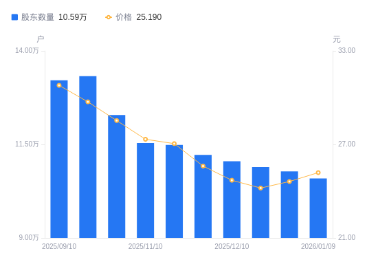日期A股户数(户)流通A股户均持股数(股)户均持股市值(万元)2026-01-091058949867.6724.862025-12-311077779695.2723.872025-12-191089179593.7923.222025-12-101104789458.2423.362025-11-281122069312.5823.852025-11-201148829095.6624.602025-11-101153689057.3424.752025-09-301228788503.7824.262025-09-191332607841.2723.312025-09-101321467907.3724.35