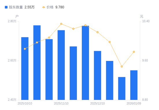 日期A股户数(户)流通A股户均持股数(股)户均持股市值(万元)2026-01-092550711841.9111.582025-12-312516512002.8411.382025-12-192598511624.0711.602025-12-102649111402.0411.612025-11-282777610874.5511.222025-11-202672511302.2111.582025-11-102755110963.3611.352025-10-312709511147.8711.232025-10-202779610866.7310.832025-10-102719611106.4710.93