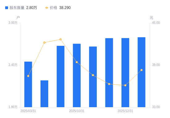 日期A股户数(户)流通A股户均持股数(股)户均持股市值(万元)2026-01-10279617345.1028.122025-12-31278407377.0226.642025-12-20278307379.6826.792025-11-30266397683.5928.862025-10-31270287573.0029.852025-09-30267347656.2832.662025-06-30218169373.7639.562025-03-31244908350.2731.262024-12-31221189245.7733.932024-09-30216309421.8634.58