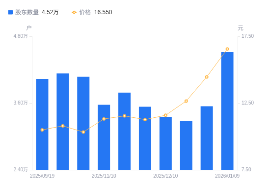 日期A股户数(户)流通A股户均持股数(股)户均持股市值(万元)2026-01-09451715943.259.842025-12-31354167580.2610.962025-12-19327618194.5810.372025-12-10335378004.969.282025-11-28353427596.138.552025-11-20378657089.998.182025-11-10356837523.548.512025-10-20407186593.216.812025-09-30413466493.077.012025-09-19403206658.306.98