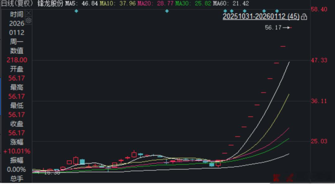 1月12日,锋龙股份再次“一字涨停”,当日股价报收56.17元/股。自此,公司股价已经连续获得12个涨停板。