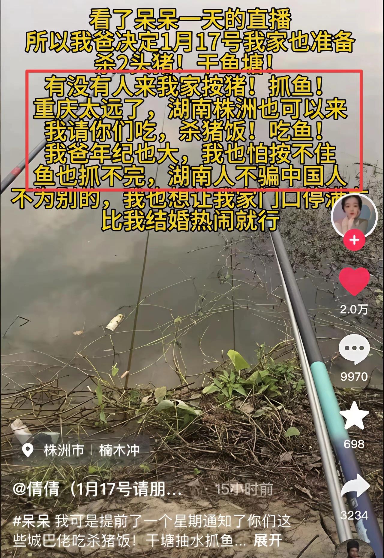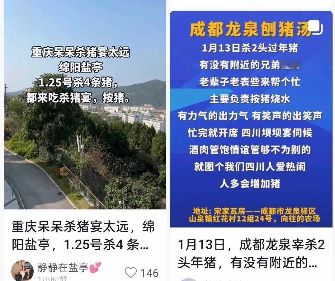 呆呆家的杀猪宴能复刻吗? 1月12日10点,活动结束了,网友陆续的开车回家了,截止到此刻,呆呆账号直播在线人数达到10多万,点赞量达千万,粉丝量163.4万。 真的是一场盛宴,数据也是高的惊人。 像这样的杀猪宴,也正在被复制。 具有传统杀年猪的地方,很多网友也学着呆呆发视频,连文案也大差不差,基本上就是父母年纪大,需要人来按猪,只是猪的数量不同,有的4头猪,有的10头猪。 别说,有的网友也是得到了回应,同样是500人的群,开了好几个也都满了,说不定也会得到同样的效果。 但是,并不是所有人都能成功,这要看天时地利人和的。 呆呆一家人很实在,父母没有心疼过年用的年猪,对于来客也是满心欢喜,合川文旅也很给力,当然网友也不是白吃,好在是皆大欢喜,没有翻车,圆满结束。 所以,少一样也不行,如果夹带私心,就会一不小心翻车,不仅自己被骂,也会连累当地文旅,并不是每个人都会复刻成功。 如果让你复刻,你会拿出你们家乡什么样的美食来招待网友,可以来评论区聊聊。