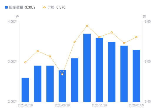 日期A股户数(户)流通A股户均持股数(股)户均持股市值(万元)2026-01-093300044579.0828.402025-12-313400043267.9327.172025-12-193500042026.2227.062025-11-283600040854.6926.022025-11-103700039197.0525.632025-09-303085547003.4329.612025-09-192800051371.4929.852025-08-202900049600.0630.162025-08-082900049600.0630.552025-07-182600055323.1533.14