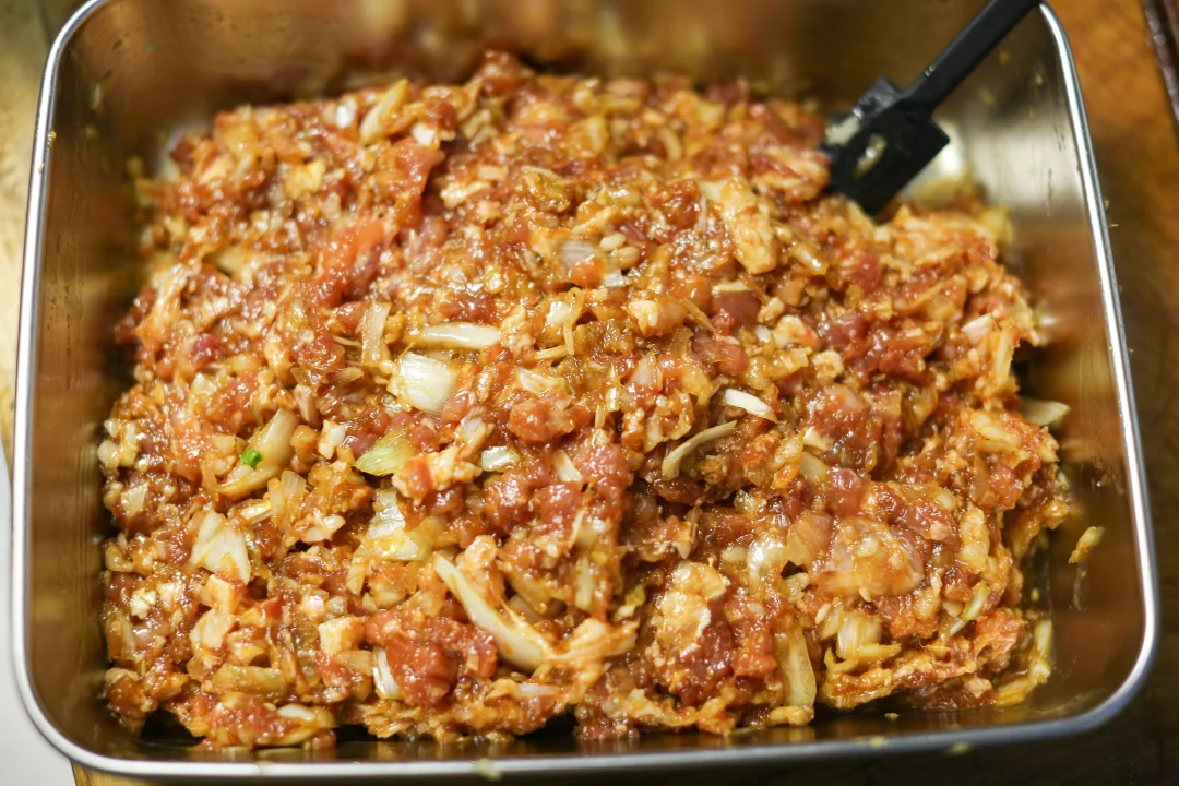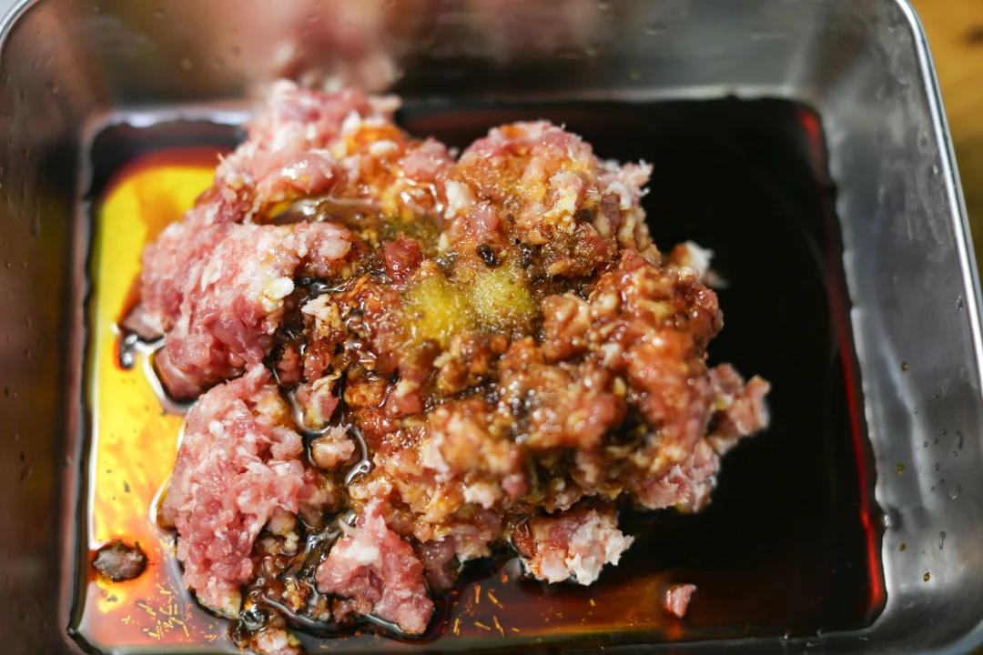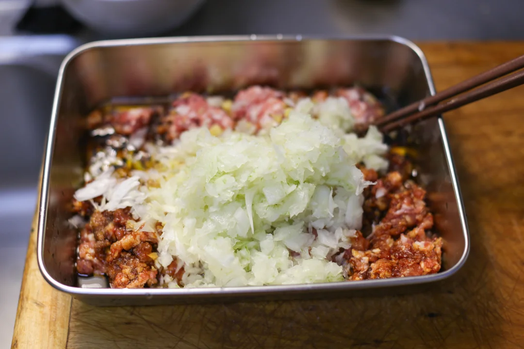 肉馅中加入生抽、老抽、花雕酒、食盐,搅拌均匀加入葱姜水,放入味精、十三香、葱姜油、芝麻油,最后放入葱花、姜末、以及洋葱末,搅拌均匀,冰箱冷藏。