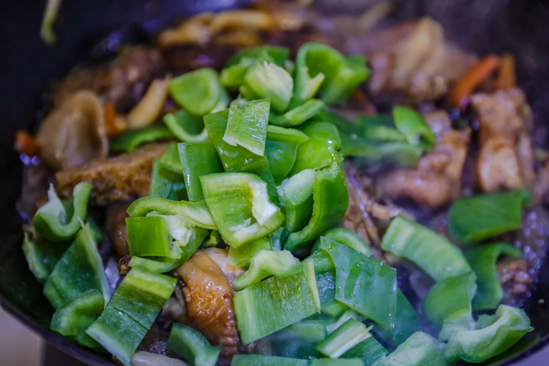 6.打开锅盖,汤汁收到粘稠,放入尖椒即可。