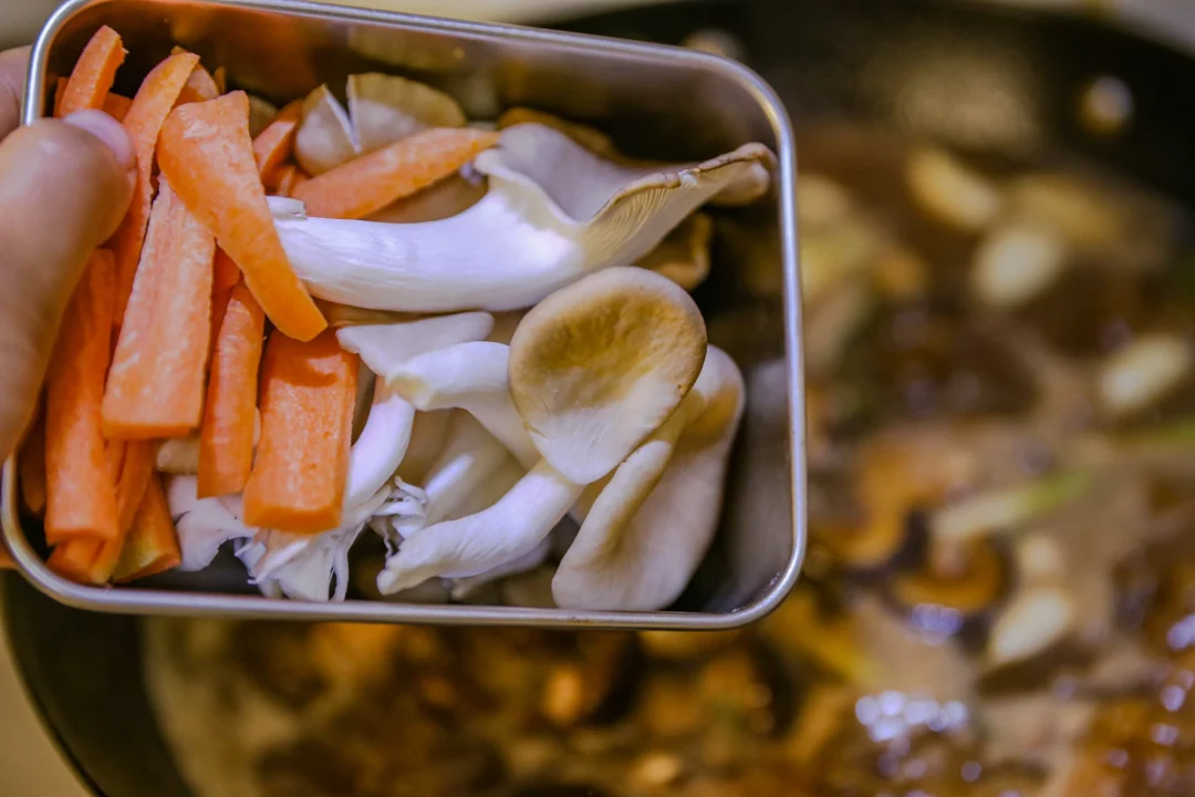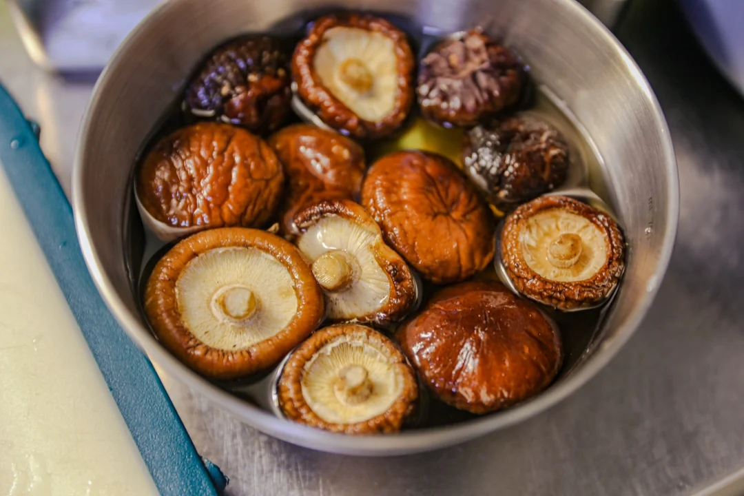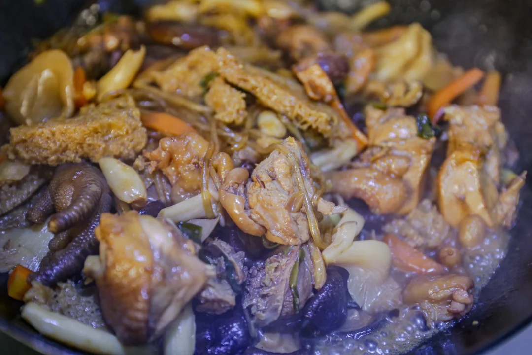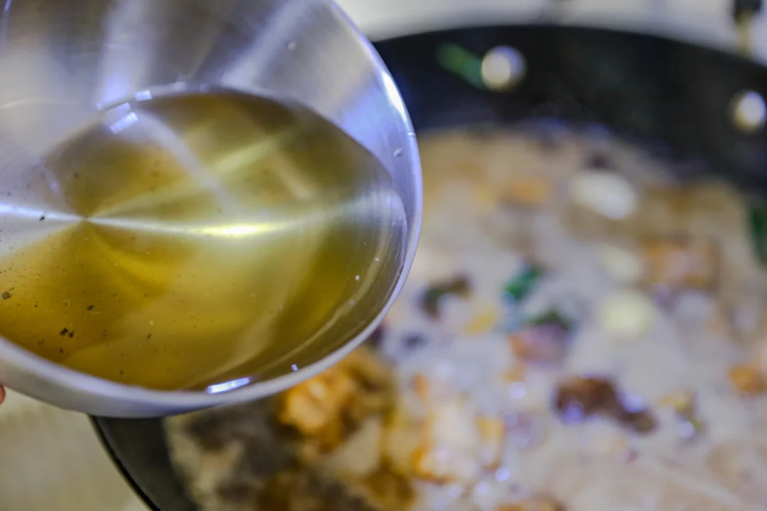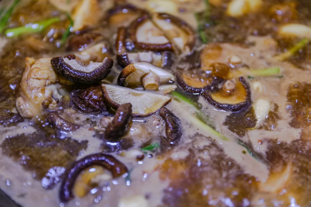 4.放入大约100克的香菇水,再加入能淹没鸡块的热水。