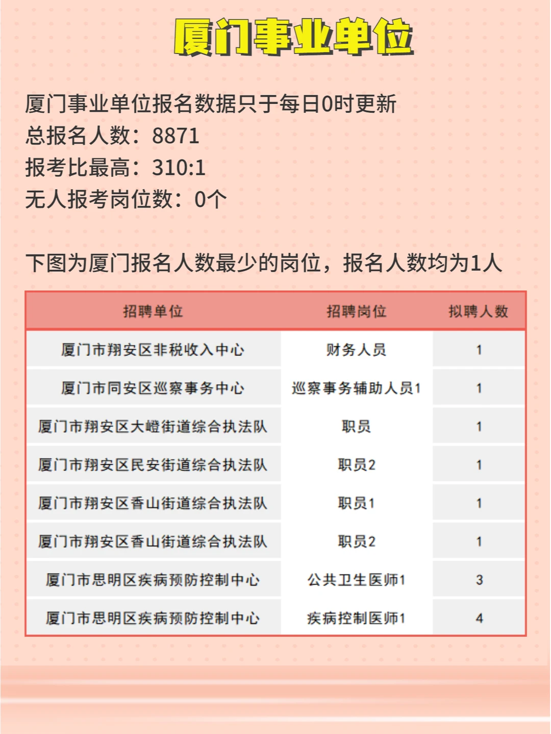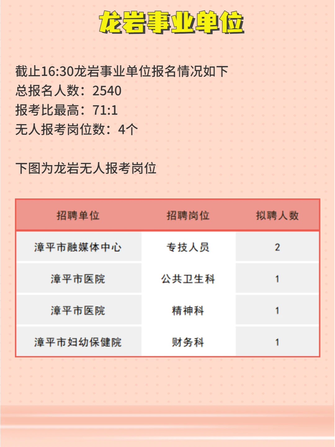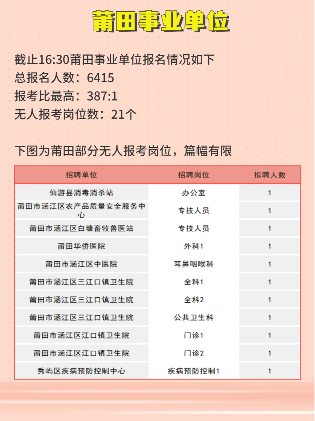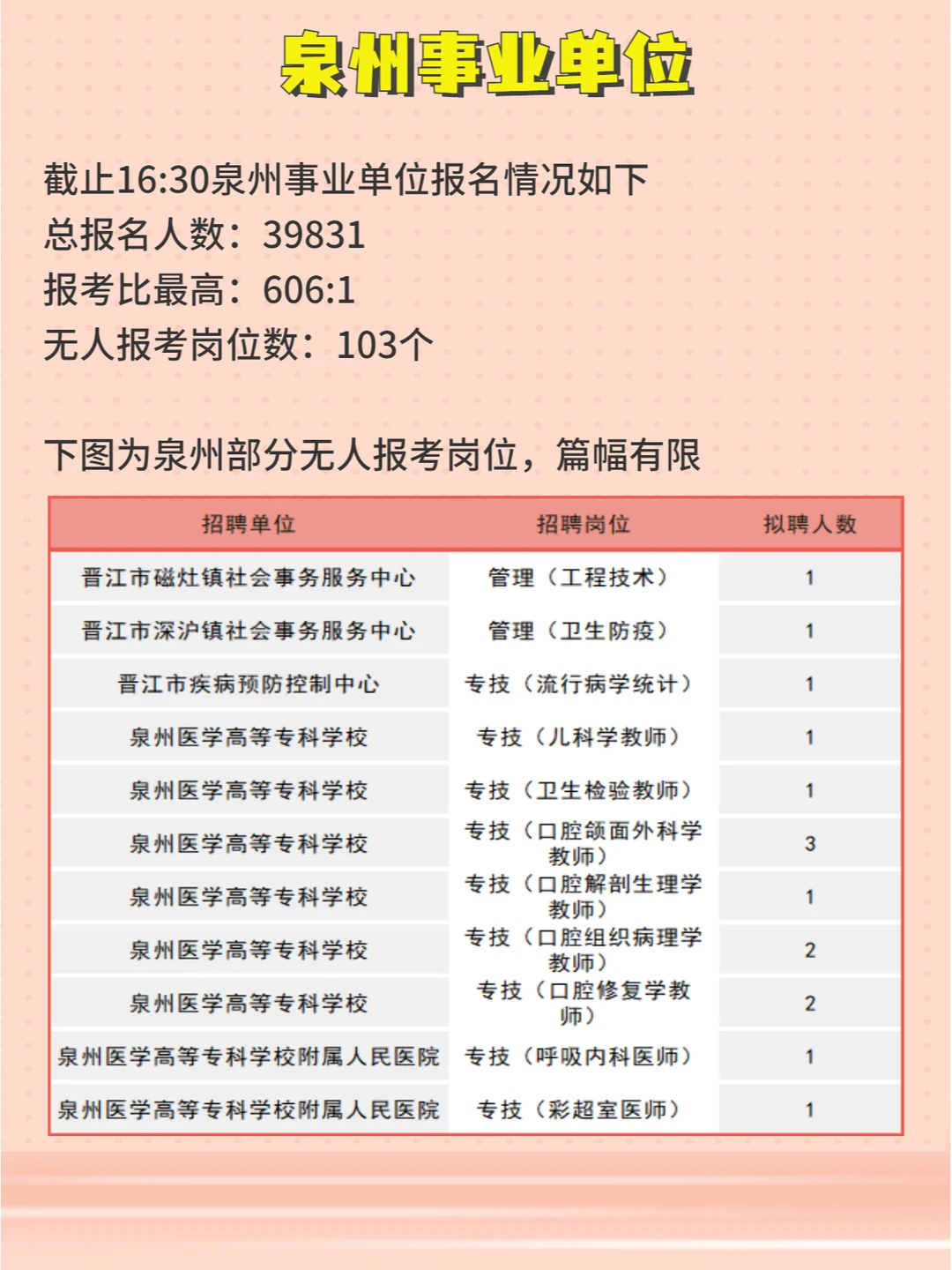 福建事业单位903联考已报名62829人!有145个岗位无人报考,各地区具体情况如下 ⏩泉州:总报名人数39831,报考比zui高606:1,无人报考岗位103个 ⏩厦门:总报名人数8871,报考比zui高310:1,无人报考岗位0个 ⏩莆田:总报名人数6415,报考比zui高387:1,无人报考岗位21个 ⏩龙岩:总报名人数2540,报考比zui高71:1无人报考岗位4个 ⏩三明:总报名人数4736,报考比zui高291:1,无人报考岗位17个 泉州、莆田报名明日截止,大家抓紧时间报名