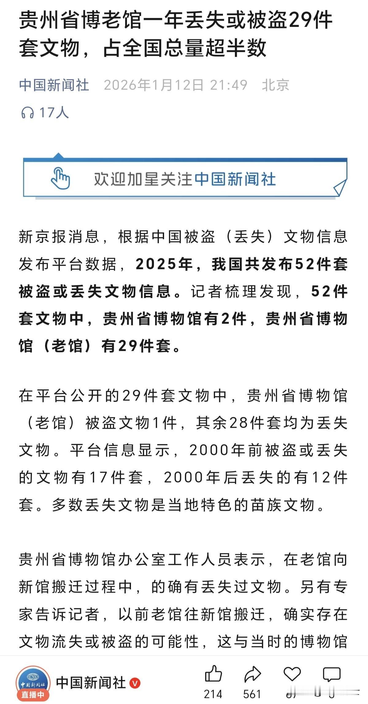 文保单位又爆文物丢失,这次是贵州省博和贵州省博老馆。据中国新闻网消息,在2025年被盗(丢失)文物信息平台显示,在全部51件被盗(丢失)文物中,贵州省博物馆2件,贵州省博物馆老馆29件,也就是说贵州省文保单位被盗(丢失)文物超过全国公布数据的6成。 文保单位担负着为国家,为民族守护文化瑰宝,传承中华文明的神圣使命。但近期的不少事件都指向了文保单位,让人怎么就这么不放心呢!如果是技术的原因,我们可以加强投入,让文物的存放更加安全。如果是人的问题,这就不是投入技术和资金那么简单了。建议还是要在制度上加大对监守自盗、玩忽职守导致文物丢失、损坏的惩戒力度,让所有文保系统的人员在心里对文物有敬畏之心。虽然国家那么大,几个臭虫不能否定全体行业人员的辛苦付出,但如果对小漏洞不除,那危害的是文物的安全,更是公众对行业的信心。但愿不在听到关于文物的负面消息,让我们得国宝可以安全的留在自己应该在的地方。