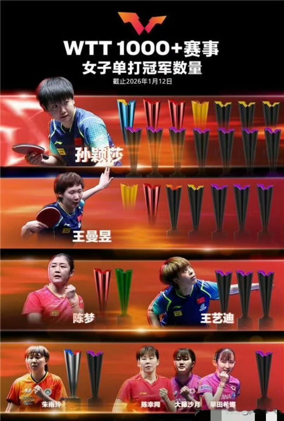 WTT1000+冠军榜更新🏓 林昀儒收获第二座冠军赛奖杯🏆🏆 朱雨玲一座大满贯+一座冠军赛🏆🏆 2026.1.12