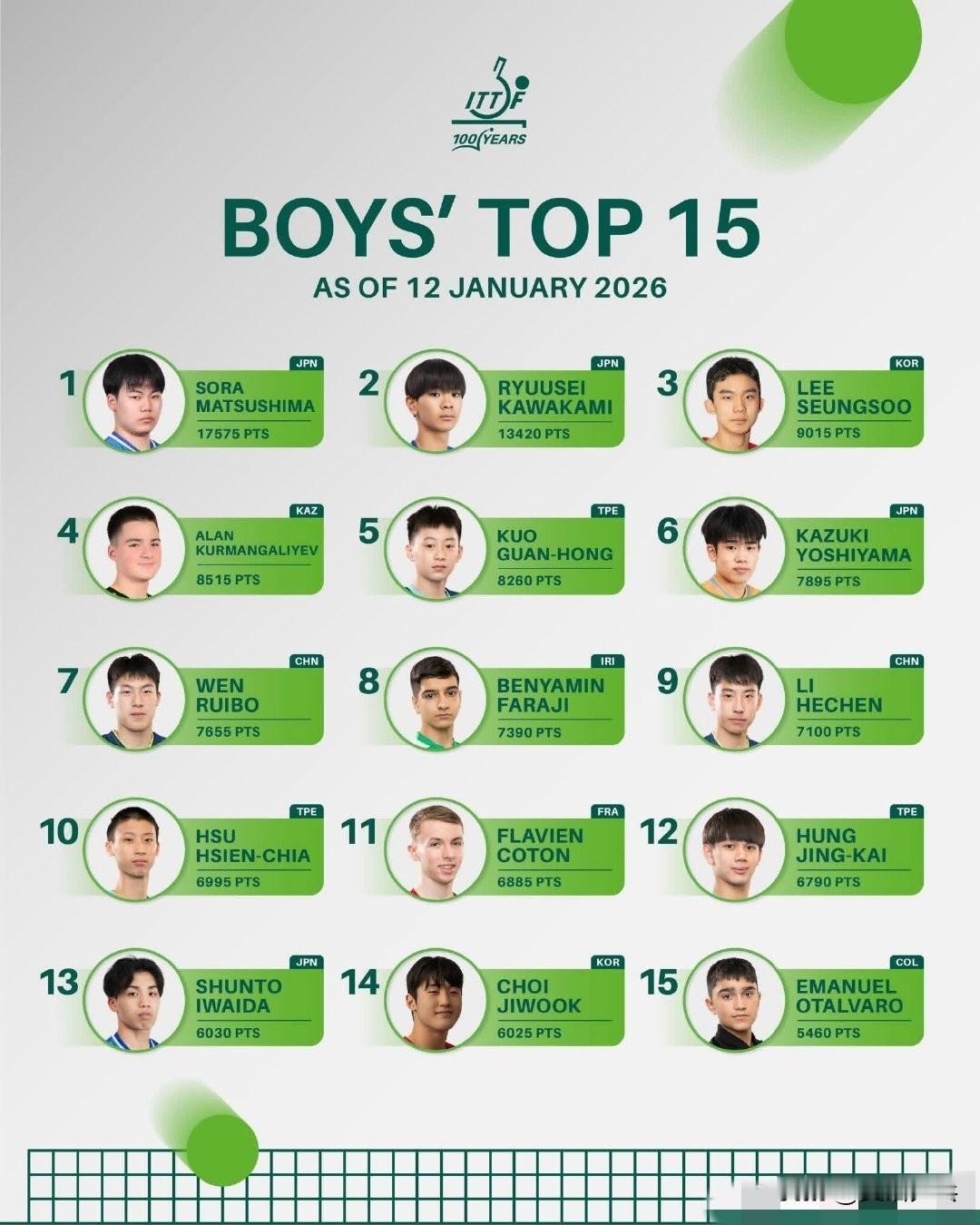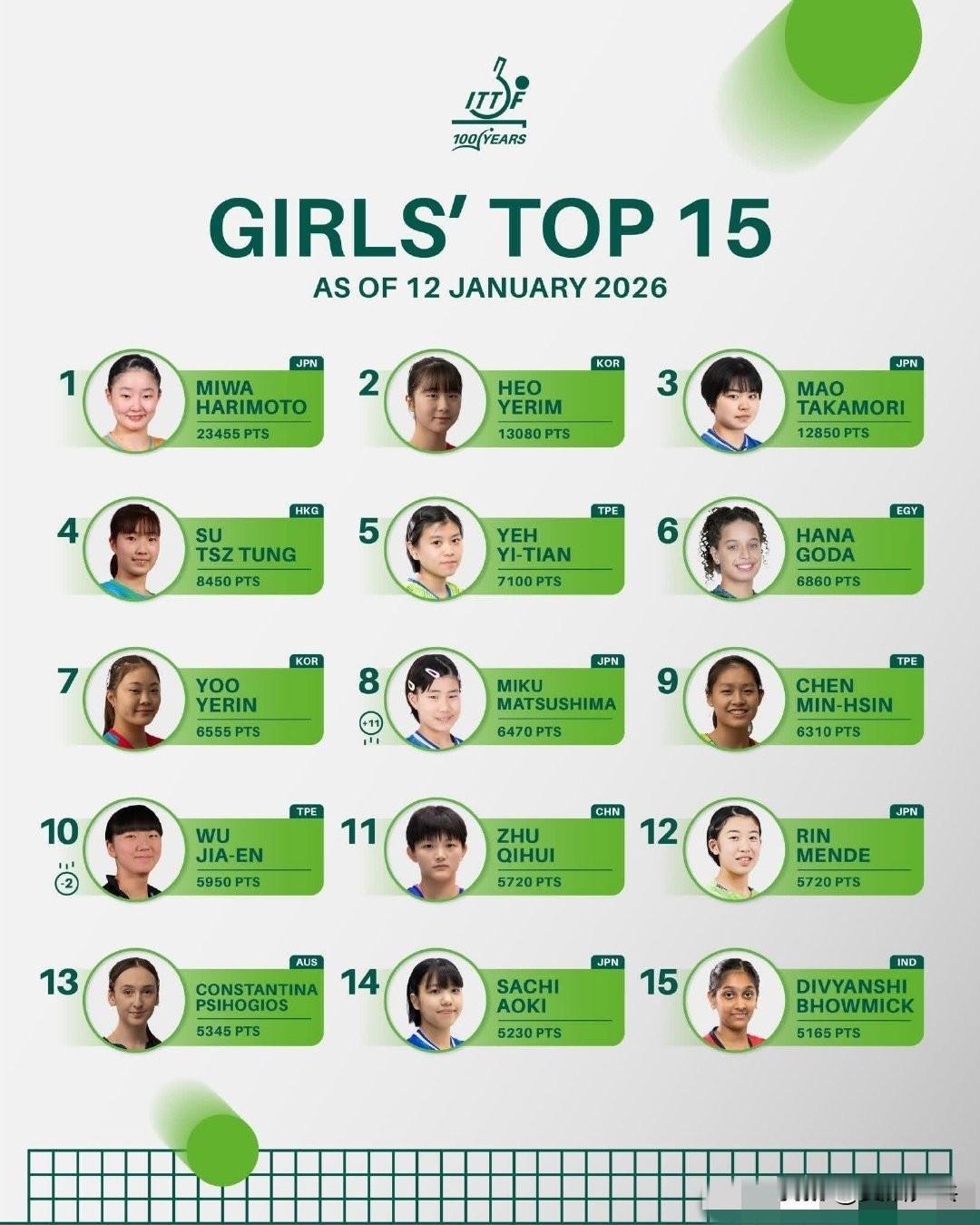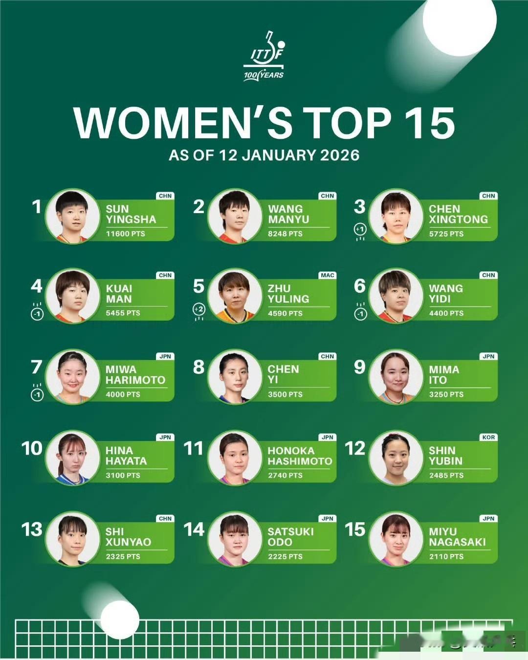 国际乒联2026年第3周世界排名 2026.1.12(星期一)