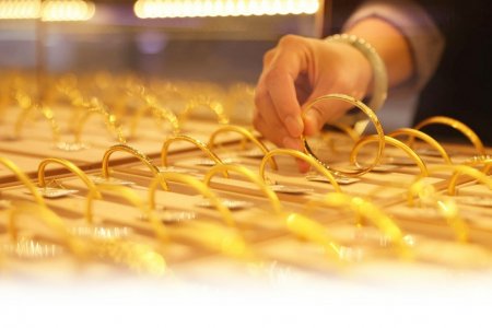 浙江省湖州市德清县乾元镇一家金店的营业员在整理黄金首饰。图据新华社客户端