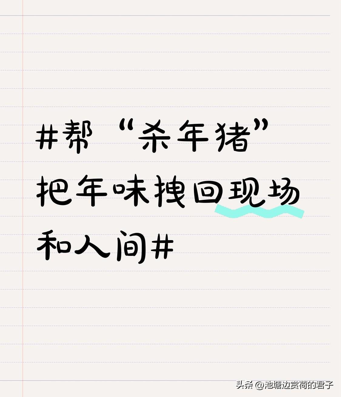 帮“杀年猪”把年味拽回现场和人间 重庆合川女子呆呆网上求助杀年猪,一下就把年味拉满了。1月9日她在网上求助,没想到引来了上千人线下帮忙、十万人云端围观。1月11日大家连杀5头猪,吃起流水席;12日即便没“按猪”活动,现场和直播间依旧热闹。 “杀年猪”在乡村本就是很隆重的事,象征着一年辛劳有回报,春节要来了。这次狂欢规模大且自发,很多陌生人带着礼物来帮忙,甚至送猪捧场。这不仅是邻里互助,更让大家在数字时代找到了久违的年味。合川文旅也迎来泼天流量,希望这能让更多人感受到传统年俗的魅力。