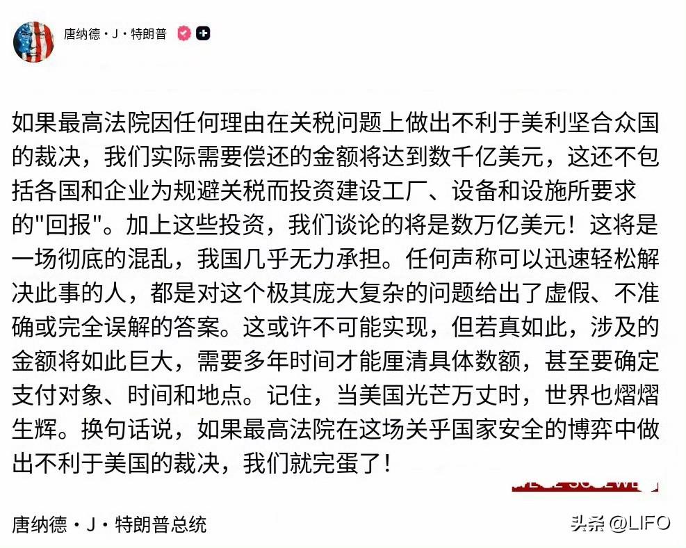 特朗普刚刚称,如果美国最高法院以“任何理由”裁定反对他的关税政策:“我们可就完蛋