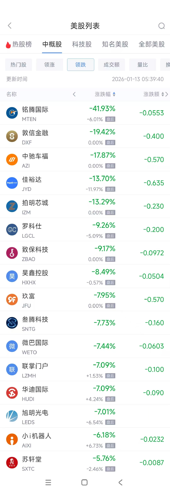 领跌中概股列表: