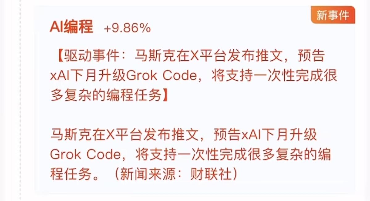 市场热点:AI编程概念! 马斯克在X平台发文称,预告下月xAI下月升级GROK