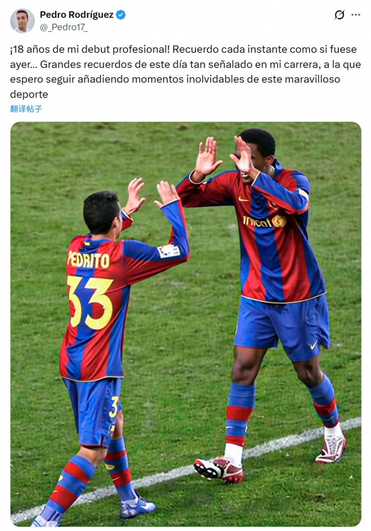 佩德罗社媒晒出照片,并写道:“今天是我职业生涯首秀18周年!每一个瞬间都恍如昨日,这是我职业生涯中值得铭记的日子,承载了太多美好的回忆,我希望未来能在这项精彩的运动中创造更多难忘的时刻。”