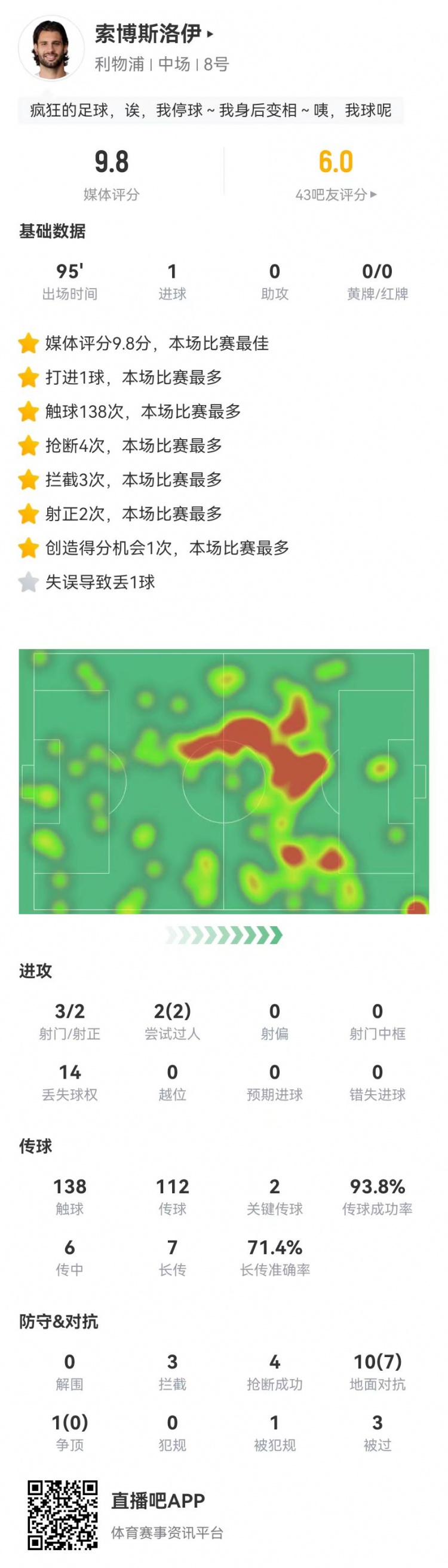 此役索博斯洛伊为利物浦踢满全场,他远射破门,11次对抗7次成功。利物浦官方宣布,经过球迷的投票,索博斯洛伊当选本场比赛队内最佳球员。