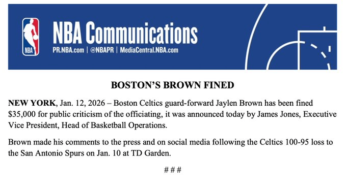 虎扑01月13日讯今日,NBA官方,NBA篮球运营执行副总裁詹姆斯-琼斯今日宣布,波士顿凯尔特人球员杰伦-布朗因公开批评裁判,被处以3.5万美元罚款。