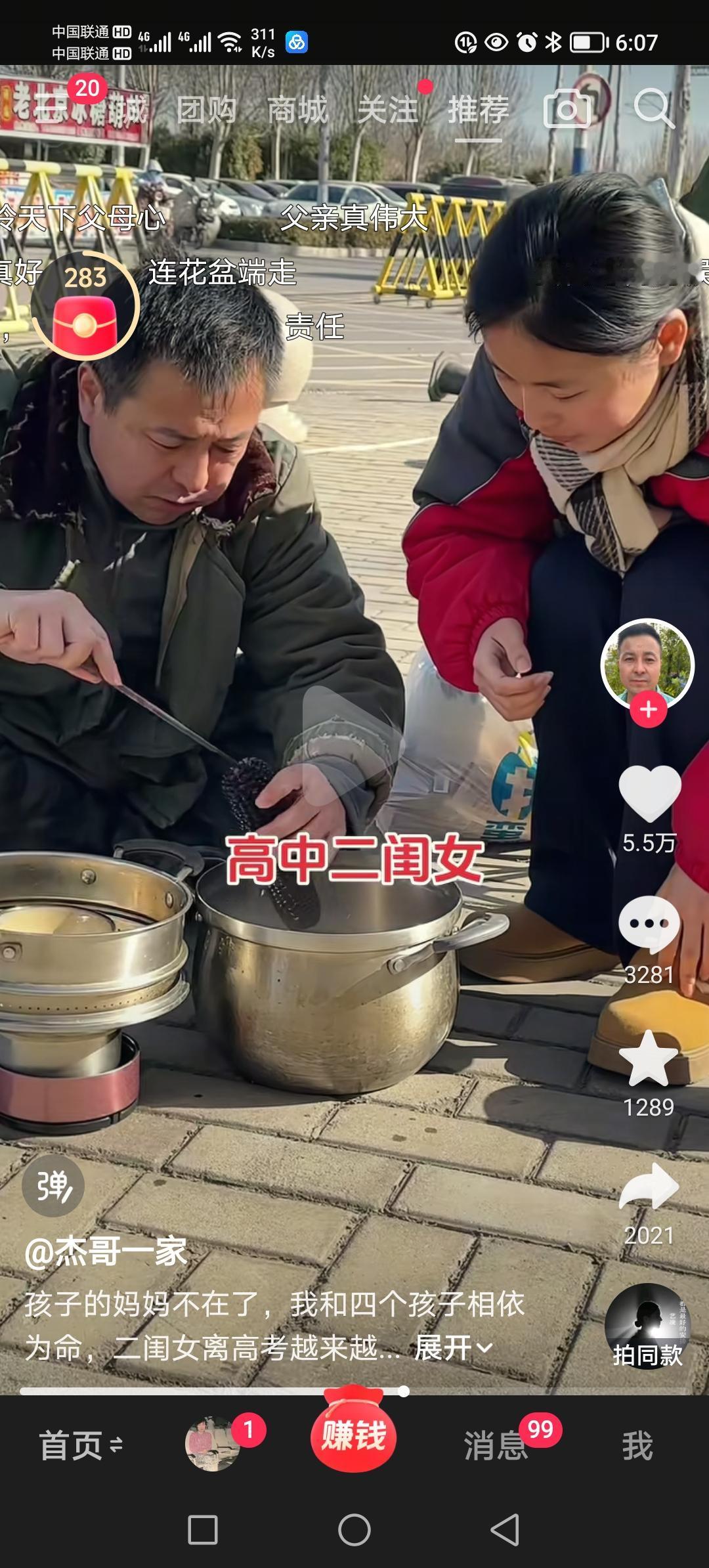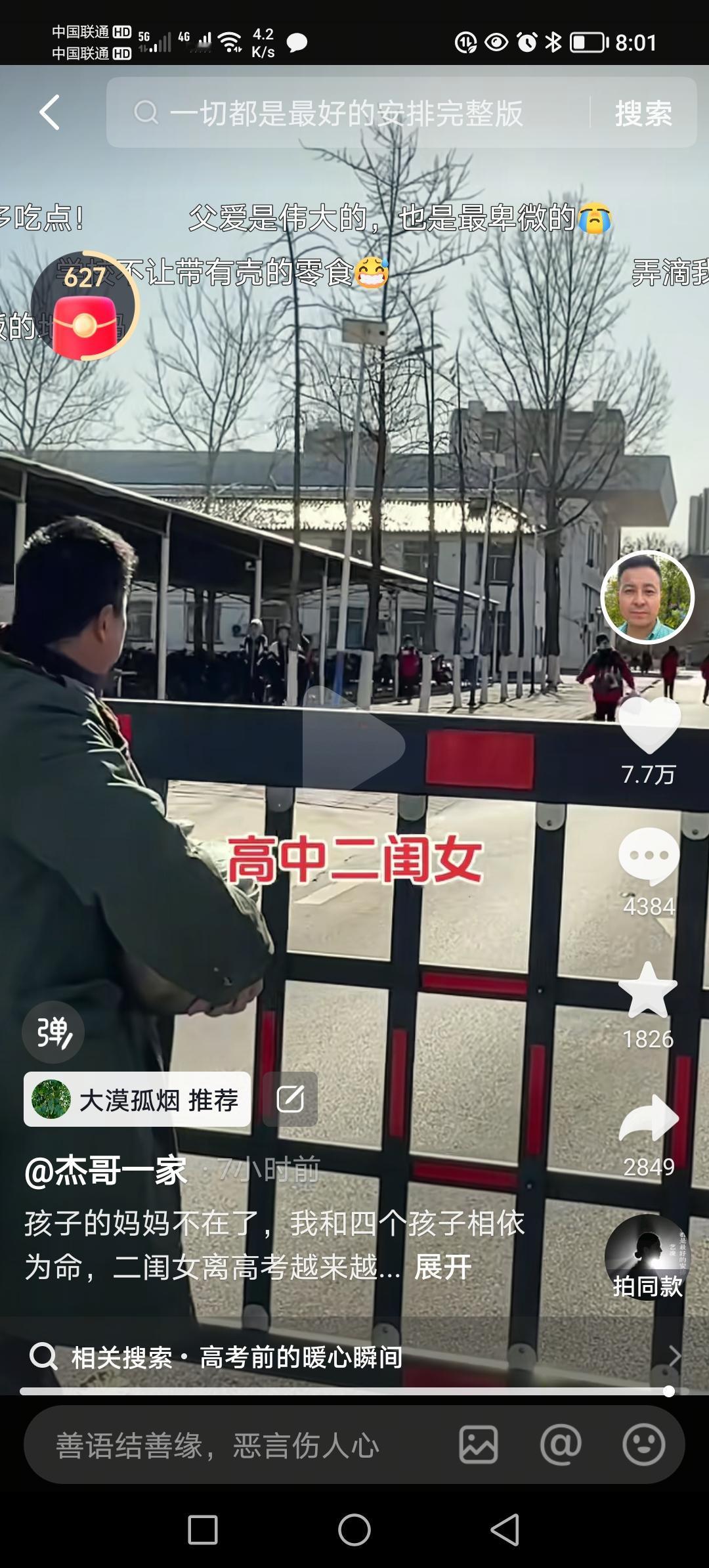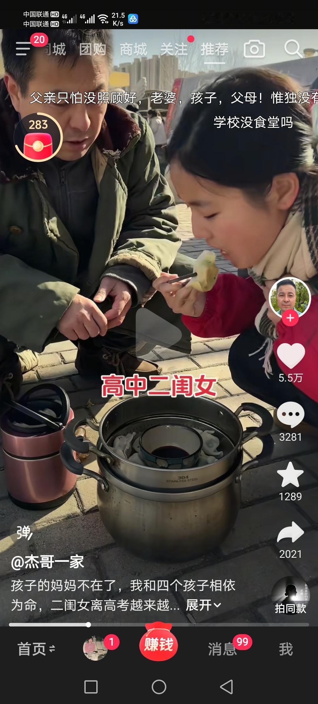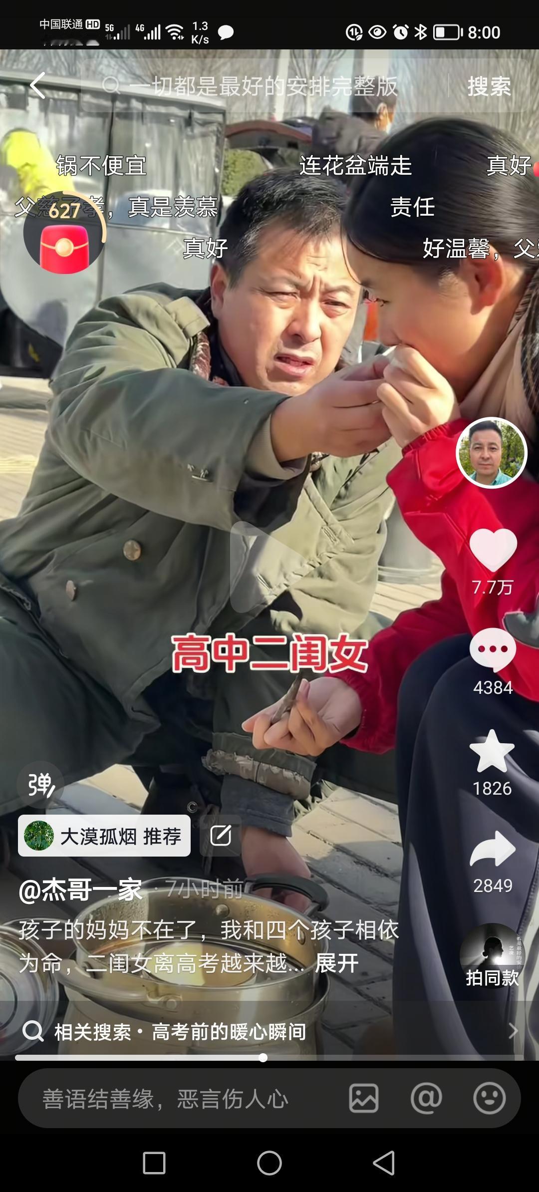 图片里的他大步流星步履匆匆。原来他是去看望上高二的女儿。他双手端着一个带屉的蒸锅,右手里还有一个保温桶。 女儿出来了,他拿出了一个马扎让女儿坐下,自己蹲在地上。 打开蒸锅那一刻,浓浓的父爱让人感动:蒸屉里是热腾腾的饺子,中间还贴心的放了一碗醋; 父亲从大衣内兜里掏出一双筷子,女儿把第一个饺子放进了爸爸嘴里; 饺子吃罢,父亲早已经把保温桶打开,里面是温度适口的米汤,女儿大口喝着,那叫一个舒服; 此时父亲变戏法似的把剥掉皮的鸡蛋送到女儿嘴边,然后又拿掉蒸屉,从锅里捞出来一个玉米! 看父亲拿出玉米抖手的动作,就知道锅里的水很热!父亲贴心地拿出一根筷子插进玉米芯里… 女儿吃玉米的时候,父亲又从大衣左口袋里摸出来一个熟鸡蛋,塞到女儿手里;这还不算,他又从大衣右口袋里掏出来一大把花生…… 他是一个父亲,是一个男人,他要养活四个孩子,还要赡养八十五岁的老母亲!他对孩子的爱,真得是发自内心无微不至。 饺子是热腾腾的,玉米是热腾腾的,米汤是热腾腾的,鸡蛋是热腾腾的……女儿的心,是热乎乎的。 或许,许多家长在周末看孩子,有的会把他们带到饭店大快朵颐;有的会带到商场买他们喜欢的零食、衣服鞋帽;有的会带去宾馆稍事放松…… 这位抖音名为“杰哥一家”博主没有那么做,饺子、玉米、鸡蛋、花生,都是自己为孩子准备的,孩子吃的舒服,父亲看着踏实,父亲爱孩子,孩子爱父亲! 像这样勤劳有爱的父亲,他的孩子怎么会不努力学习? 我被这位父亲,感动了!