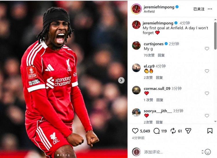 弗林蓬社媒晒出庆祝进球的照片,配文:“我在安菲尔德的首粒进球,我永远不会忘记的一天。”