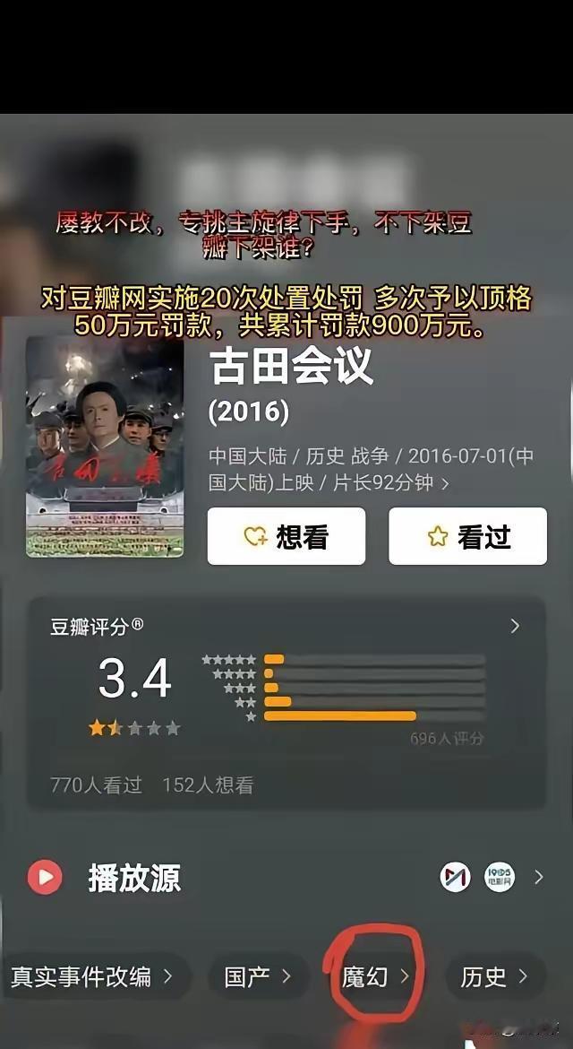 汪海林对豆瓣一些行为的评价:非常恶毒,也不是一次两次了。 为何如此说呢?原来是豆瓣把《遵义会议》分类到了“狗”,把《古田会议》分类到了魔幻。再联系到豆瓣多次因类似的事情被处罚,却屡教不改,所以汪海林感慨到这一行为非常恶毒。 众所周知遵义会议是我们历史上一次非常重大的会议,甚至可以说对我们来说都是一次生死攸关的会议。历史课上基本都会讲,每个学生也基本都知道。可豆瓣却把其分类到了“狗”类上!这已经是恶意满满,让人气愤了! 大家讨论下,豆瓣为何屡教不改?豆瓣的评分机制还能相信吗?