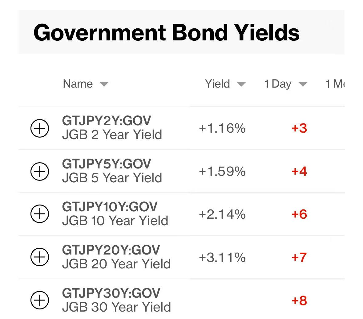 与此同时,日本30年期国债收益率一度上升12个基点至3.52%,截止发稿,日本30年期国债收益率报3.48%,日本20年期国债收益率上涨7个基点至3.11%,10年期国债收益率上行6个基点至2.14%,日本5年期国债收益率上行4个基点至1.59%。