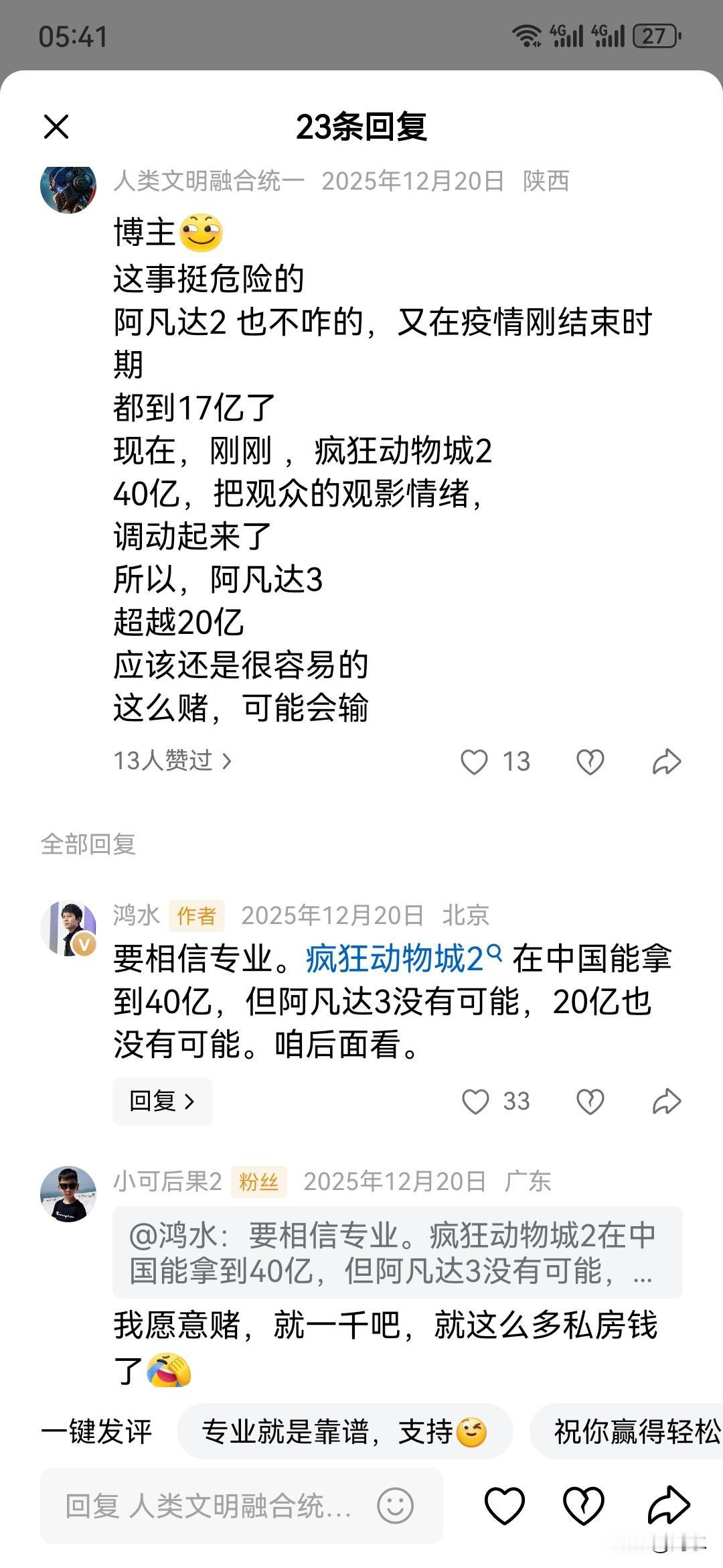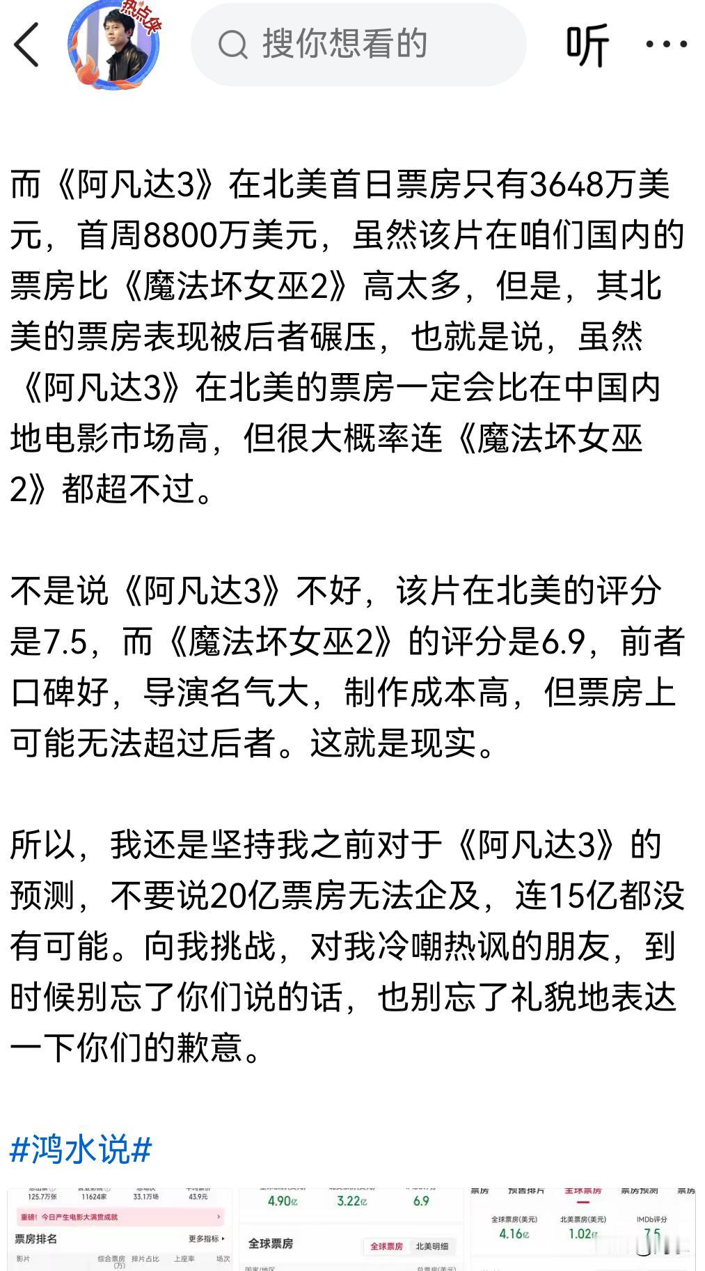 刚刚,我看了下实时票房,上映了26天的《阿凡达3》累计综合票房为10.46亿(如图一),这是包含服务费的,如果不包含服务费,该片的分账票房实际上还没有破10亿,实际分账票房为9.50亿(如图二)。 虽然现在《阿凡达3》密钥延期了一个月,但是,那些和我打赌的人,已经没有任何胜算,我的预测不但没变,而且还在调低最终预测票房。我之所以再一次说这个事情,就是因为有个别人在留言区完全不顾事实,刻意说我被打脸。我就不明白,事实就是事实,我也希望每一部电影的票房都好,但尊重事实就那么难吗? 回头看我之前的票房预测: 12月18日,《阿凡达3》上映之前,我对该片票房的预测原话是: 前两部《阿凡达》在中国内地电影市场的票房都是17亿左右,我预测第三部不超过20亿实际上是已经给了较高的预期,悲观一点的话,该片可能连17亿都超不过。 12月20日,看完电影以后,我从预测该片不超过20亿,调低了对于该片的票房预期至15亿以内,我的文章原话是: 一部电影的票房能不能高开高走,最终是由市场决定的,是观众说了算。我认为,《阿凡达3》将是系列电影中票房最低的一部,前两部都是17亿左右,这一部连17亿都不可能超过,15亿也不可能,先努力破10亿吧。我是电影从业者,我尊重市场,尊重观众选择,不尊重情绪表达。 然后,就出现了一些人对我各种冷嘲热讽,虽然我一辈子也拍不出什么像样的票房电影,但对于票房的预测还是有专业基础的,不是说我多牛,而是就事论事,于是就有一些人非要和我打赌,还让我不要删除文章,我不但没有删除文章,而且还在12月19日置顶了当天发表的公开文章,并公开接受一些人的挑战。 如今快一个月了,我的置顶文章还在,且没有任何修改。只是令我不解的是,除了个别人歪曲事实,说我预测该片票房不过10亿,已经被打脸以外,其他和我打赌的那些人,全部选择了沉默,我就想问一下,你们口嗨完以后,你们会兑现你们的承诺吗?到底是你们被打脸了,还是我被打脸了?