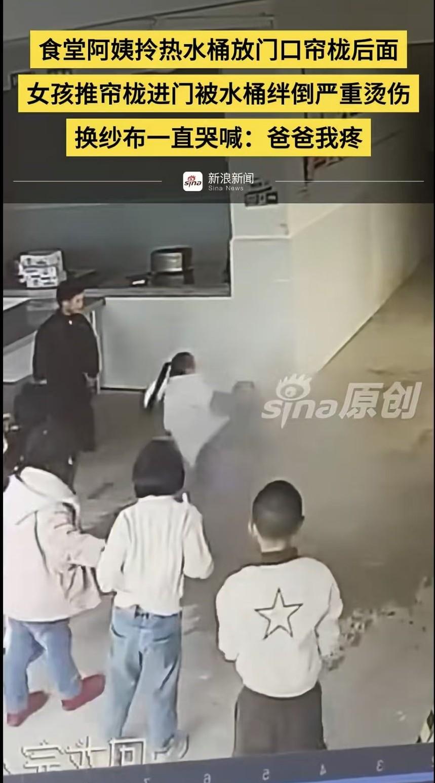 只因一个热水桶没放对位置,女孩被烫伤严重,食堂阿姨和学校的安全意识都太差了。 1月7日,贵州某小学,食堂阿姨提着俩热水桶走过一群孩子来到门前。 注意看门帘和水桶都是塑料白色,不易分辨。 她把两水桶随意放在地上,在拿开挡板时,三年级的女孩跑进来喊同学出去,正好撞到水桶。 虽然阿姨已经很快去救她,但热水还是浇到孩子身上。 不知道大人被烫到没有,那个女孩反正伤得不轻,在医院里疼得大哭,她母亲也跟着抹泪。 这个视频可以做成安全片在学校放了,食堂工作人员平时也得有安全培训,有危险预判的能力啊!