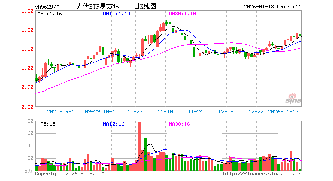 1月13日,光伏ETF易方达(562970)开盘跌0.34%,报1.174元。光伏ETF易方达(562970)重仓股方面,阳光电源开盘跌0.17%,隆基绿能涨0.00%,特变电工跌0.08%,TCL科技跌0.21%,通威股份跌0.24%,正泰电器涨0.00%,晶盛机电跌2.25%,TCL中环跌0.33%,德业股份跌0.60%,捷佳伟创跌1.94%。