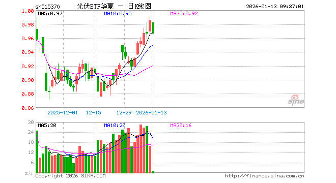 1月13日,光伏ETF华夏(515370)开盘跌0.30%,报0.982元。光伏ETF华夏(515370)重仓股方面,阳光电源开盘跌0.17%,隆基绿能涨0.00%,特变电工跌0.08%,TCL科技跌0.21%,通威股份跌0.24%,正泰电器涨0.00%,阿特斯跌0.44%,TCL中环跌0.33%,晶澳科技跌1.23%,德业股份跌0.60%。