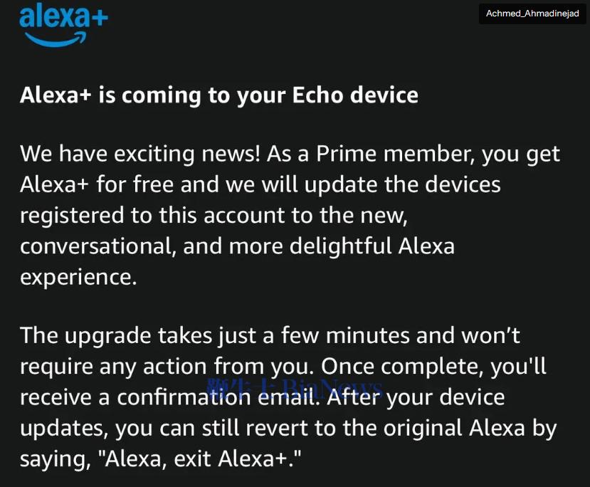 据多名Prime会员在社交平台披露,亚马逊向其发送通知称,作为会员权益,其Alexa助手将被“免费升级”为AlexaPlus。升级完成后,用户会收到确认邮件。如不希望继续使用AlexaPlus,可通过语音指令“Alexa,exitAlexaPlus”切换回旧版本。