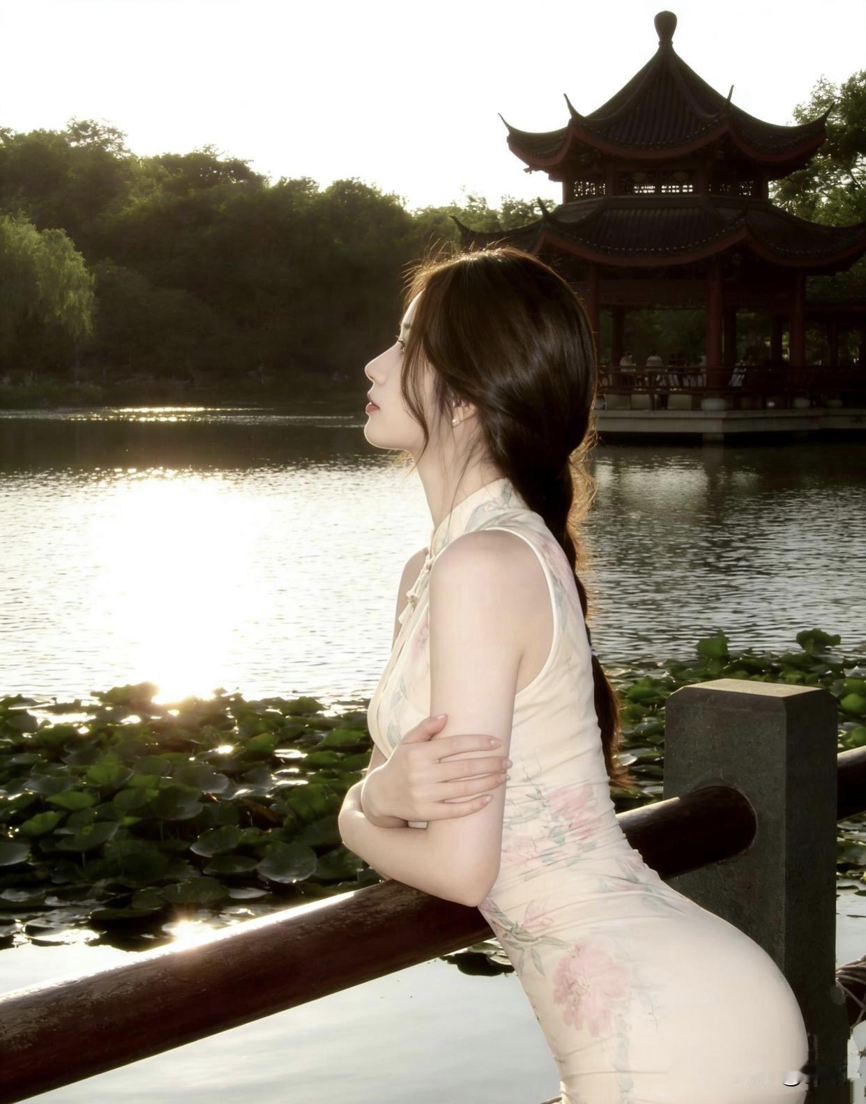 美图欣赏,看图写诗 《晚霞映旗袍》 七言绝句: 晚照摇波映粉襟, 旗袍裁得藕花深。 凌波欲拾荷间露, 一捻清风绾素心。 现代诗: 夕阳把湖面揉成金箔, 旗袍裹着江南的柔, 贴在她身上。 发辫垂落, 像柳丝拂过水面, 指尖轻触荷叶的刹那, 涟漪漫过亭台。 她站在荷风里, 像一朵水墨画里的花。 图片来源于网络