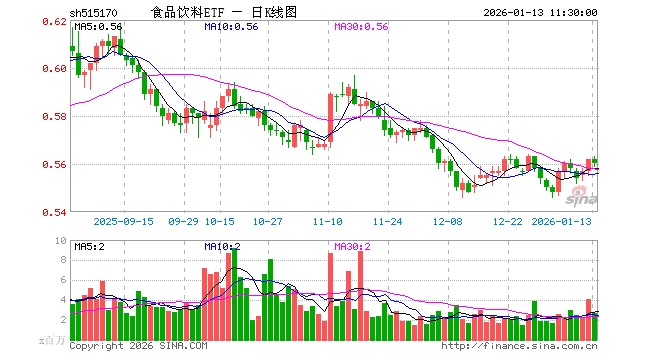 1月13日,截止午间收盘,食品饮料ETF(515170)跌0.36%,报0.560元,成交额1.50亿元。食品饮料ETF(515170)重仓股方面,五粮液截止午盘涨0.03%,贵州茅台跌0.30%,伊利股份跌0.07%,泸州老窖跌0.02%,山西汾酒跌0.90%,海天味业跌0.08%,东鹏饮料涨0.64%,洋河股份涨0.35%,今世缘跌0.61%,古井贡酒跌0.23%。