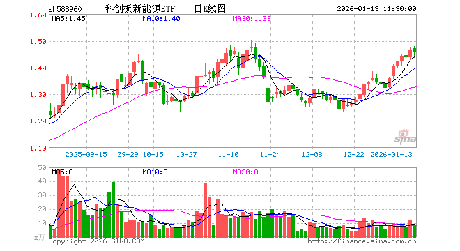 1月13日,截止午间收盘,科创板新能源ETF(588960)跌0.48%,报1.457元,成交额1123.51万元。科创板新能源ETF(588960)重仓股方面,天合光能截止午盘跌3.47%,晶科能源跌1.72%,天奈科技跌1.57%,阿特斯跌4.16%,大全能源跌3.09%,厦钨新能涨4.45%,容百科技涨0.65%,孚能科技跌0.19%,聚和材料涨4.44%,嘉元科技跌0.39%。