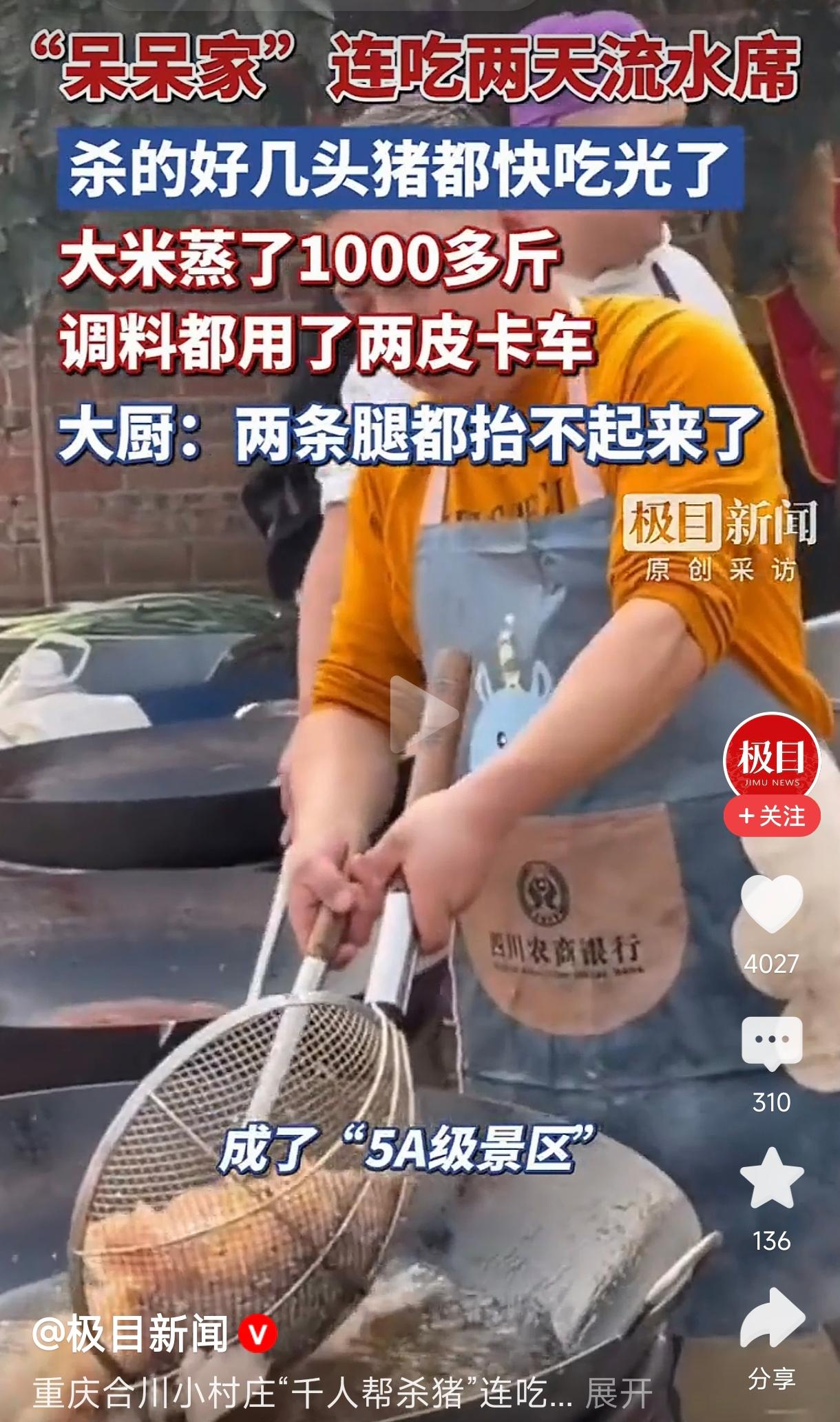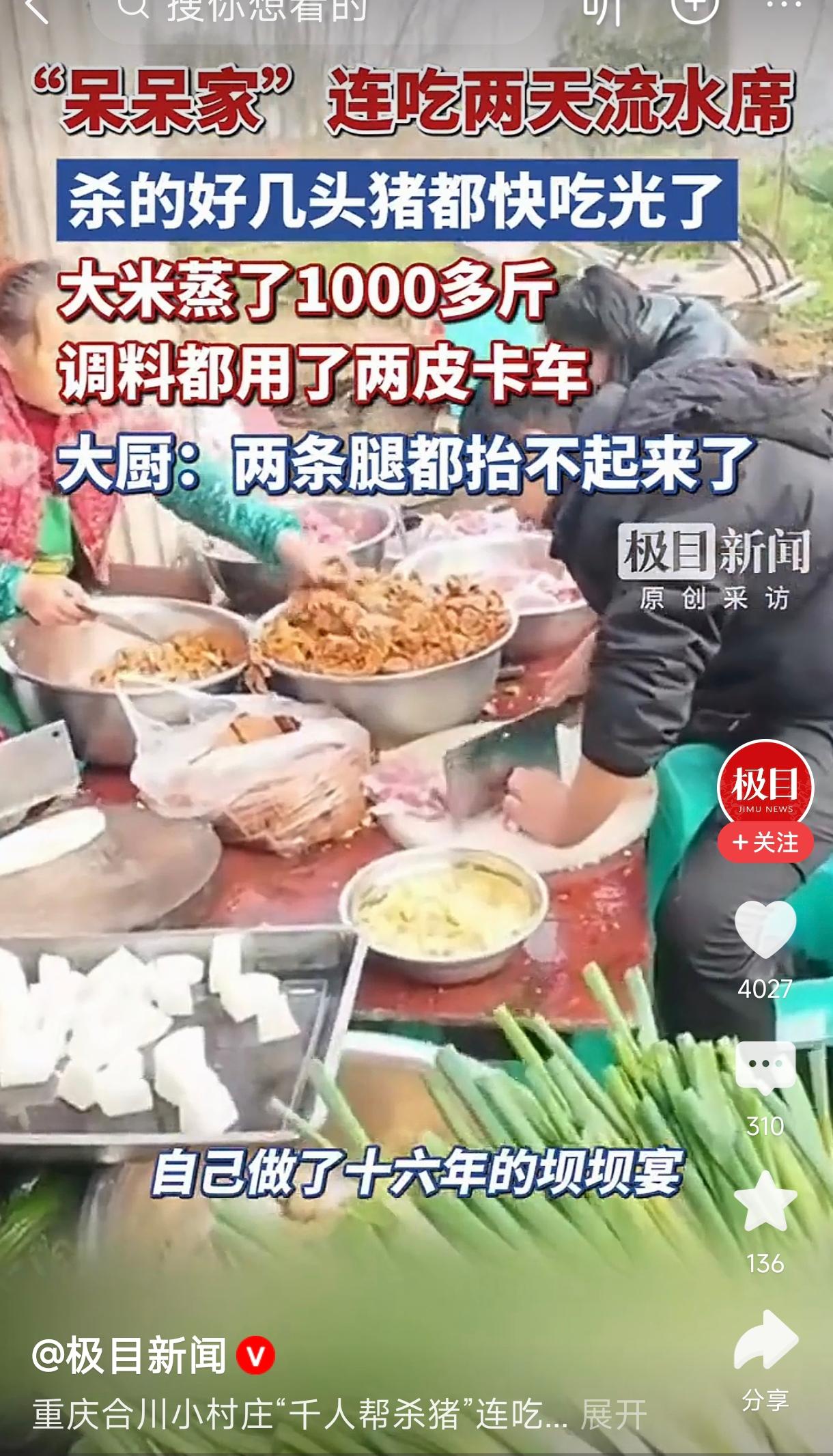 合川按猪吃流水席 大米蒸了1000多斤 这次合川小村庄举办的“千人帮杀猪”流水席活动,真是规模空前、热闹非凡。据报道,连续两天的盛大宴席不仅吸引了大量村民和外来宾客,还体现了当地浓厚的乡土情谊和热情好客。 据主厨介绍,为了满足如此庞大的宴席需求,杀了几头猪,几乎都快吃光了,蒸了超过1000斤的大米,调料用量也堪比两皮卡车。这种规模的宴席不仅展现了村民的团结和热情,也成为当地的一大特色和文化传承。 这样的活动不仅是一次盛大的美食盛宴,更是乡村社区凝聚力的体现,也让外界得以一窥合川农村的淳朴与热情。希望未来能有更多类似的乡村文化活动,传递温暖与团结的力量。合川杀猪宴 合川杀年猪