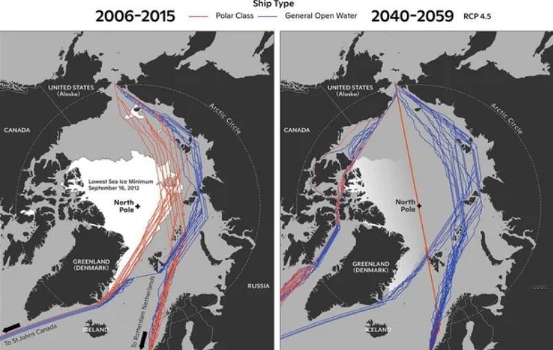 格陵兰岛的争议肯定是老美对俄罗斯和东大产生了芥蒂。 格陵兰对特朗普政府极具吸引力有多重原因,包括其自然资源——石油、天然气和稀土矿产储备。 但该岛在地图上的地理位置——以及环绕其边界融化的海冰——同样至关重要。 格陵兰周边海冰融化为使用北海航线创造了更多机会——使货运人通过在欧洲和亚洲之间走更短的航线,节省数百万美元的燃油费用。 一艘俄罗斯商船在破冰船的协助下,于2021年2月冬季首次穿越该航线。 与苏伊士运河航线相比,北海航线可为货运人节省多达50%的成本,考虑燃料和其他费用,例如将日本到欧洲的距离缩短至约10天,而绕非洲南端航行再通过苏伊士运河则需约22天。 北线从中国上海到荷兰鹿特丹的类似行程约10天。 预计未来几十年内,这些航线将成为格陵兰周边常规船只(蓝色)和极地级船只(红色)可行的北极航线。