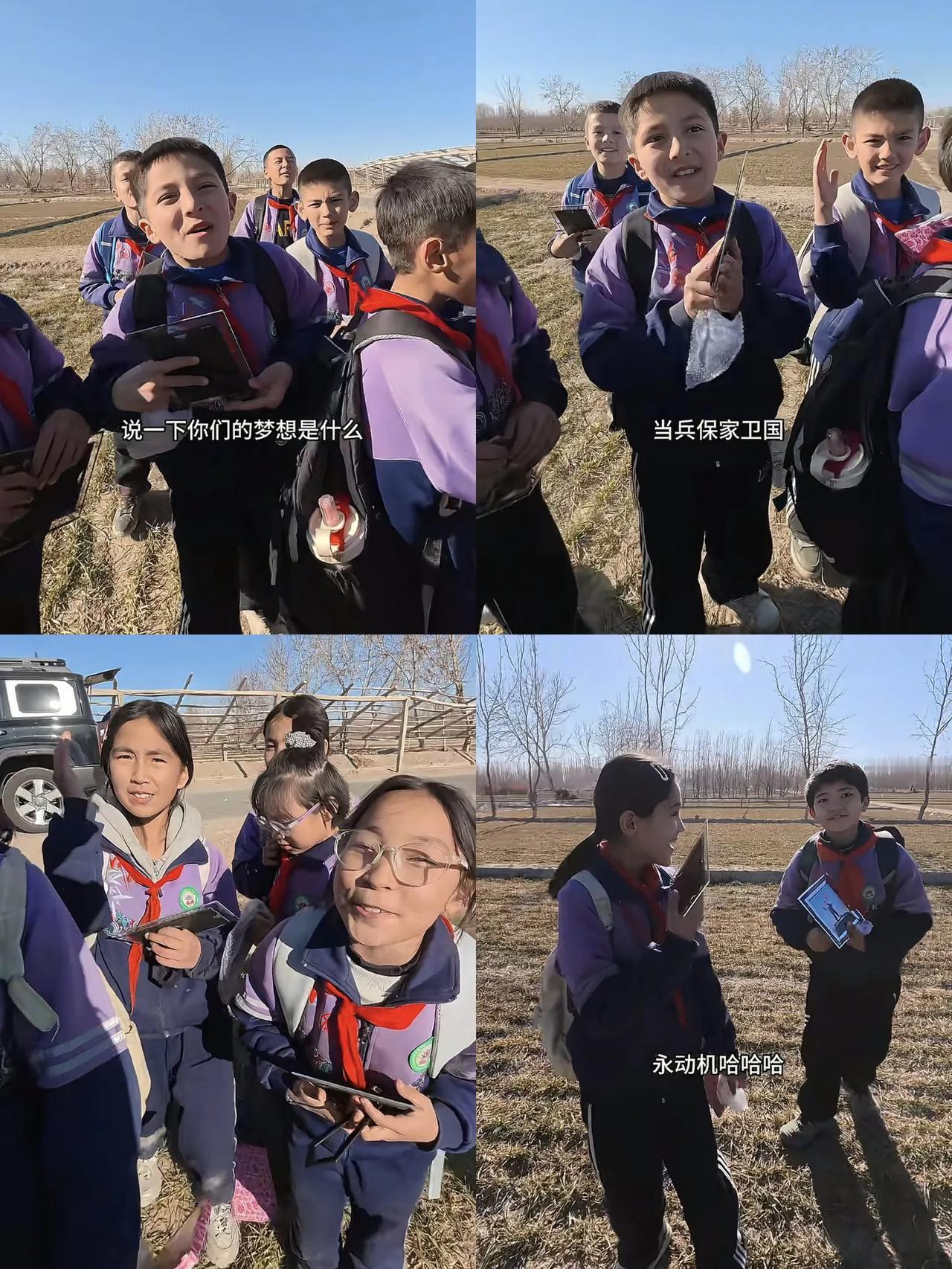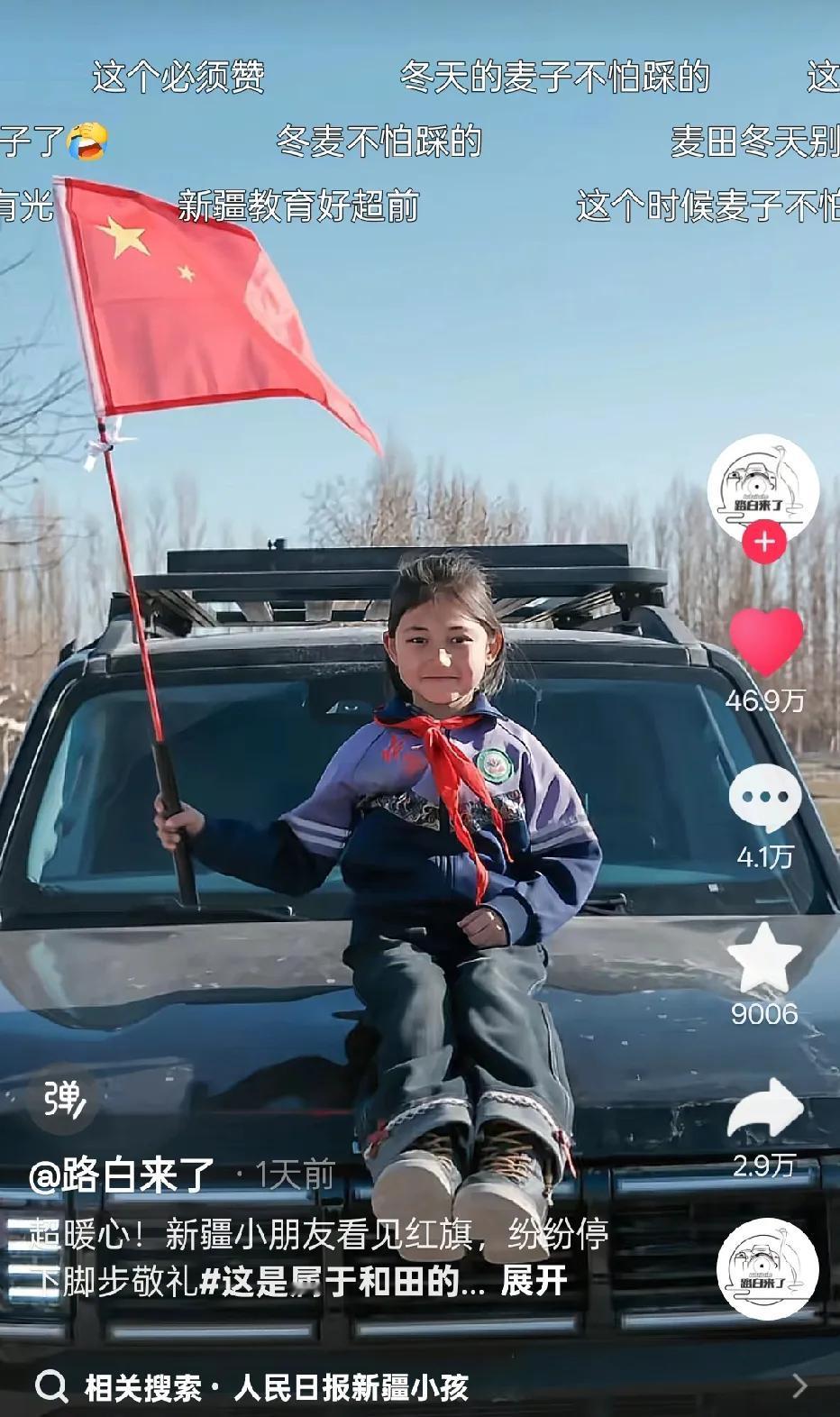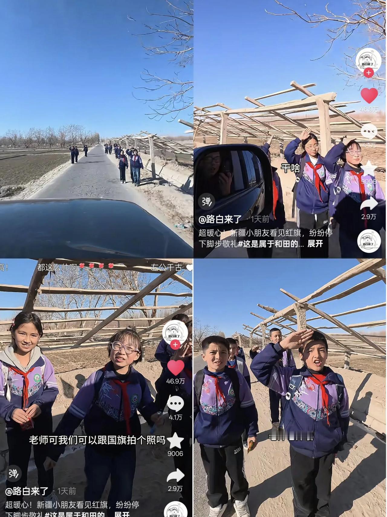 一大早刷到这个视频热泪盈眶!被新疆这群孩子感动了!看到五星红旗,在远处的路边就齐刷刷的敬礼了,这一次,给新疆的教育工作者——老师们,致敬!好老师真的去了新疆! 视频里可以看到博主开车路过,发现路边两排,都站着一群学生对着自己驶过来的车子敬礼,博主感到很疑惑,就下车去问小女孩,说:“你们都敬礼干啥?”,女孩立马回复道:“见到我的国旗”![赞]博主听到后,恍然大悟,原来这群孩子们是在给国旗敬礼,因为博主的车上有国旗! 博主接着问孩子们:“谁教你们看到国旗要敬礼的?”孩子们听到后,齐声的回答:“老师”! 这一刻,我泪流满面,给新疆的教育工作者致敬,把孩子们教育的这么好,这么爱国!这一刻,我对新疆的印象越来越清晰了,原来,新疆这么美好,有这么多热爱祖国的老师、孩子,他们的感情是那么的浓烈而饱满! 视频里孩子们还和博主分享了零食,博主也让孩子们上车,跟国旗拍了照片,孩子们挥舞着国旗,这个画面太美好了,太有意义了,已经超过了这个视频本身,这一刻,真想说,我们的孩子,真的很爱国! 特别是当博主问新疆的这群孩子们,他们的梦想是什么时,一位女生脱口而出:“报效祖国”,还有人说:“当兵保家卫国”![赞] 而当博主再问下一个问题时,说:“如果可以发明一样东西,你想发明什么?” 其中一个男孩眼神清澈且很有力量的说道:“我要发明时空穿越机,回到当年,然后把现在装备都送过去打小鬼子”,这一刻,升华了!博主不禁发出“哇……”的声音! 那个视频,我看了一遍又一遍,每一遍都热泪盈眶,这一次,给新疆“上大分”!孩子们说的每一句话都太有力量了,他们太可爱了!从小就这么热爱祖国!我已经迫不及待想看更多新疆这群孩子的视频,还有新疆的美食!希望我们的民族团结,永远热爱!爱你们!敬礼的小孩 新疆少年
