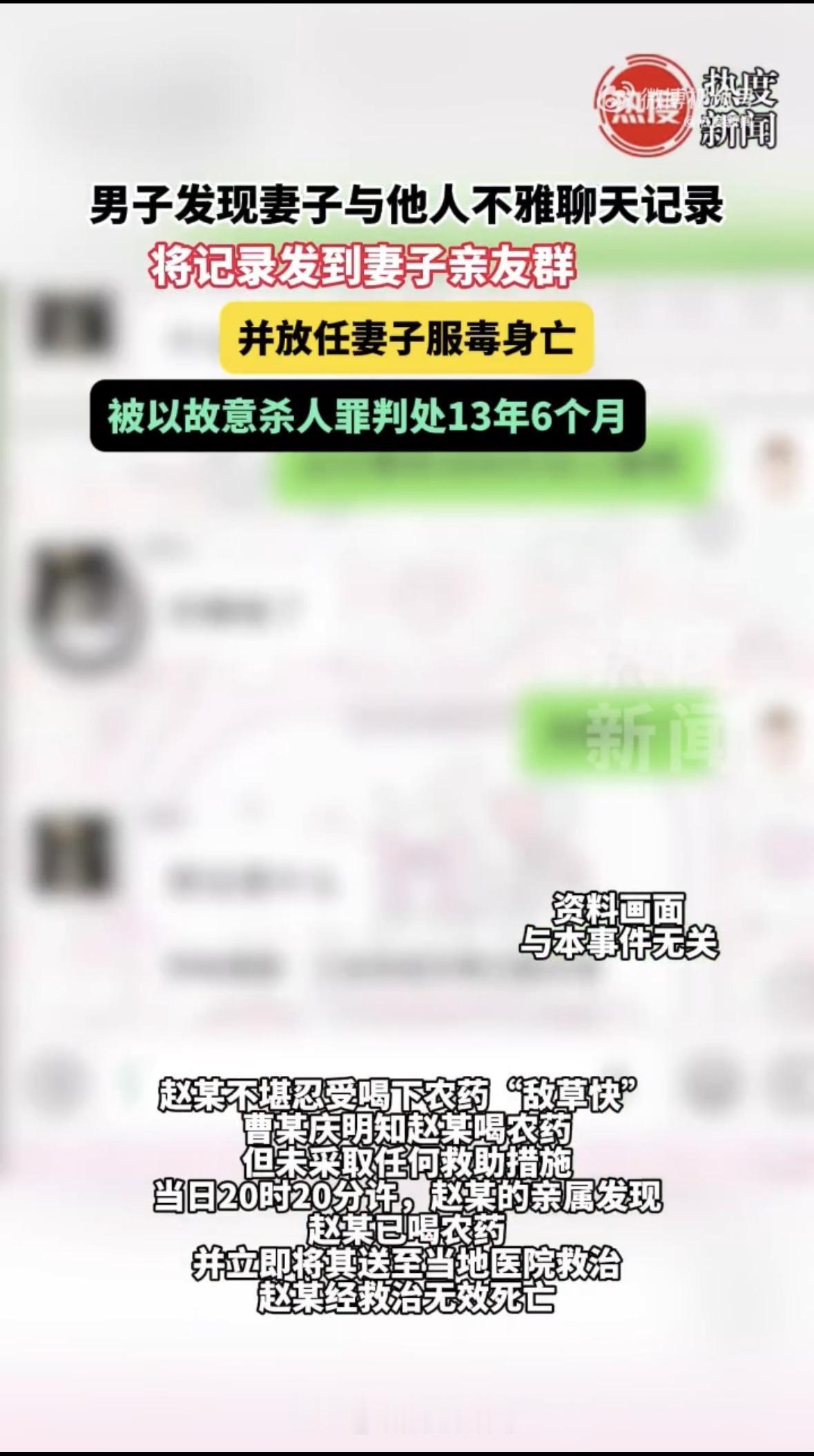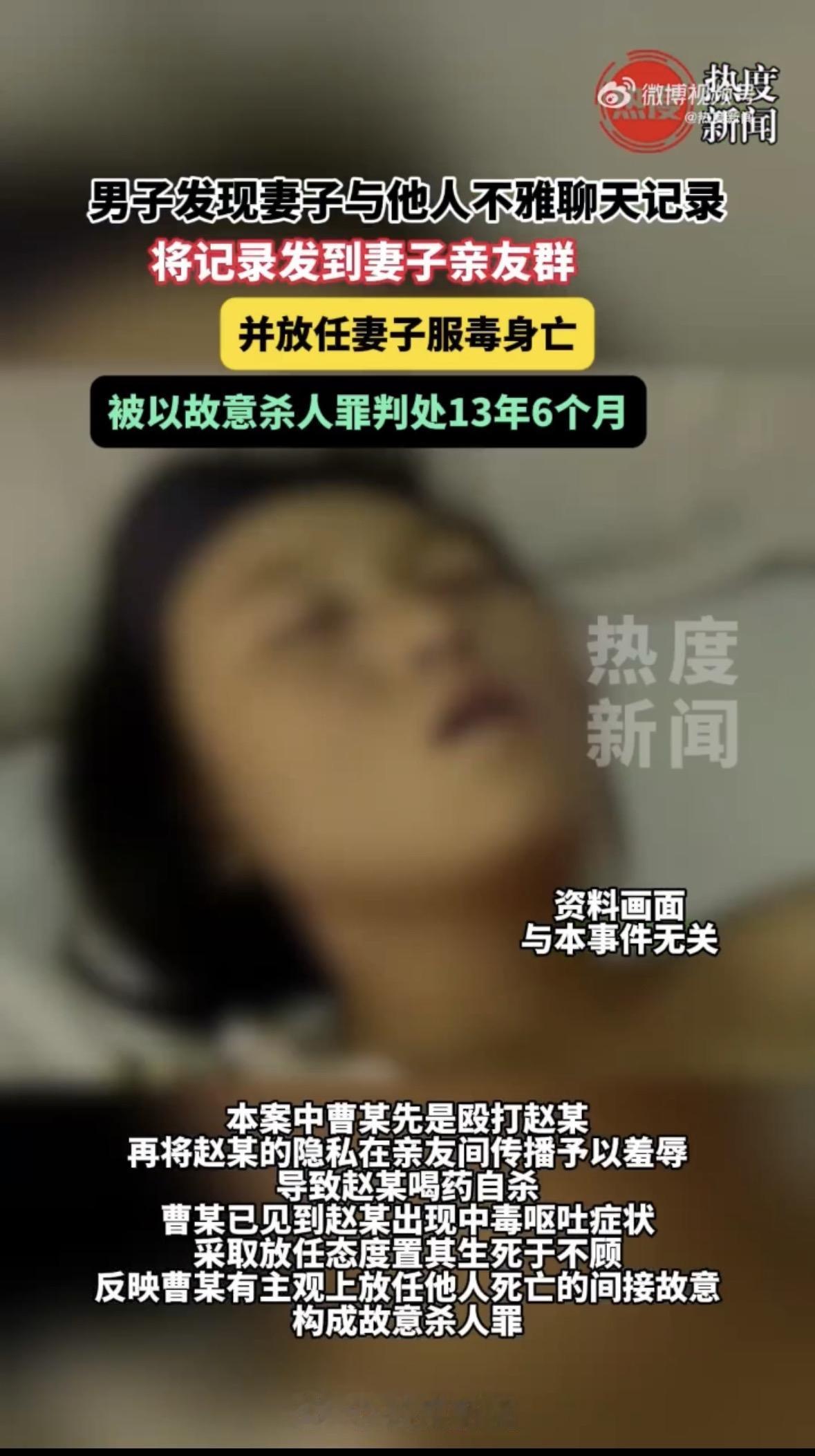 当你看到另一半手机里有和别人不雅的聊天记录,你会怎么处理呢? 山西的这位男子,看到妻子手机里的秘密,瞬间炸了。打骂不算完,他做了一件更狠的事——把那些最难堪的聊天记录,扒光了直接扔进了几十号人的家族群。还@了丈母娘和小姨子。 就这样,把妻子的尊严,摁在地上当众碾碎。妻子受不了,转身喝下了农药。 然后,眼睁睁看着妻子痛苦呕吐、生命流逝,这个男人,这个丈夫,竟然什么都没做。没有抢下瓶子,没有打一个求救电话,他就那么看着。直到两个多小时后,亲属赶来,才把奄奄一息的她送医,可一切都晚了。 法院判决,故意杀人罪,十三年半有期。他上诉了,但被驳回了。这不是一时冲动的“家丑”,这是赤裸裸的公开羞辱和见死不救。婚姻里纵有千般不是,也绝不是动用“私刑”、肆意践踏对方人格的理由。更别说在生死关头,那冷漠的旁观,与凶手无异。 一个生命的逝去,换来的是一纸冰冷的判决。可留给两个家庭的,是一生都抹不掉的痛。