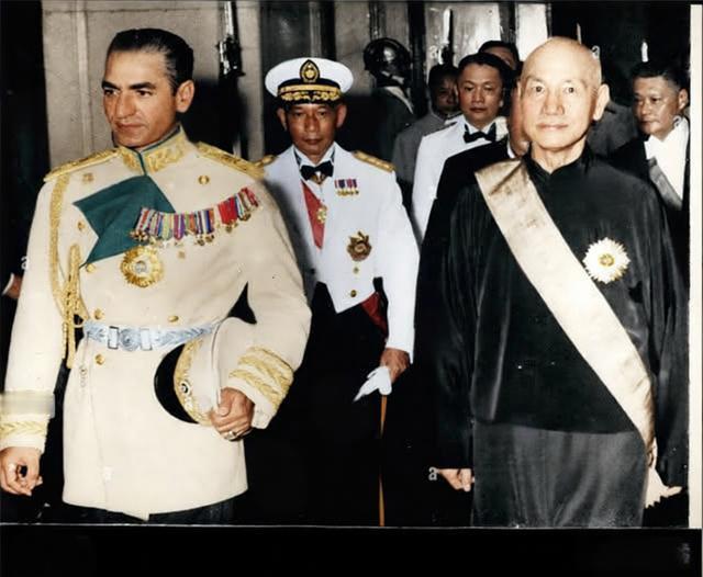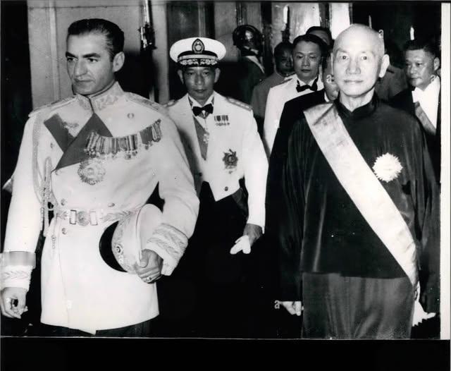 1958年,伊朗国王穆罕默德·礼萨·巴列维到台湾,与蒋介石合影瞬间。 左侧是巴列维国王,身着军礼服,胸前悬挂多枚勋章、手持军帽,气势威严;右侧是蒋介石,身穿传统黑色长袍马褂,佩戴“国光勋章”等国家最高荣誉绶带与胸花,仪态雍容稳重。1950年代,冷战格局下,蒋介石与伊朗王国均为美国盟友体系。