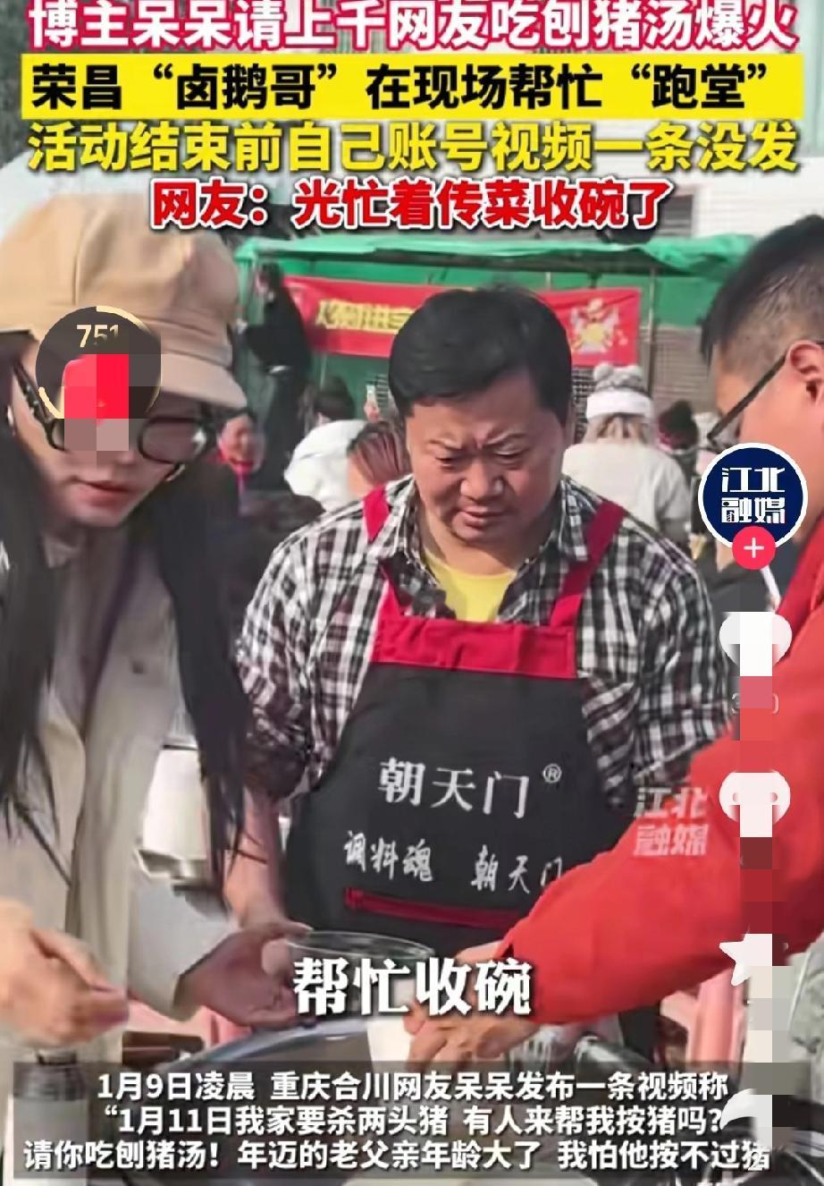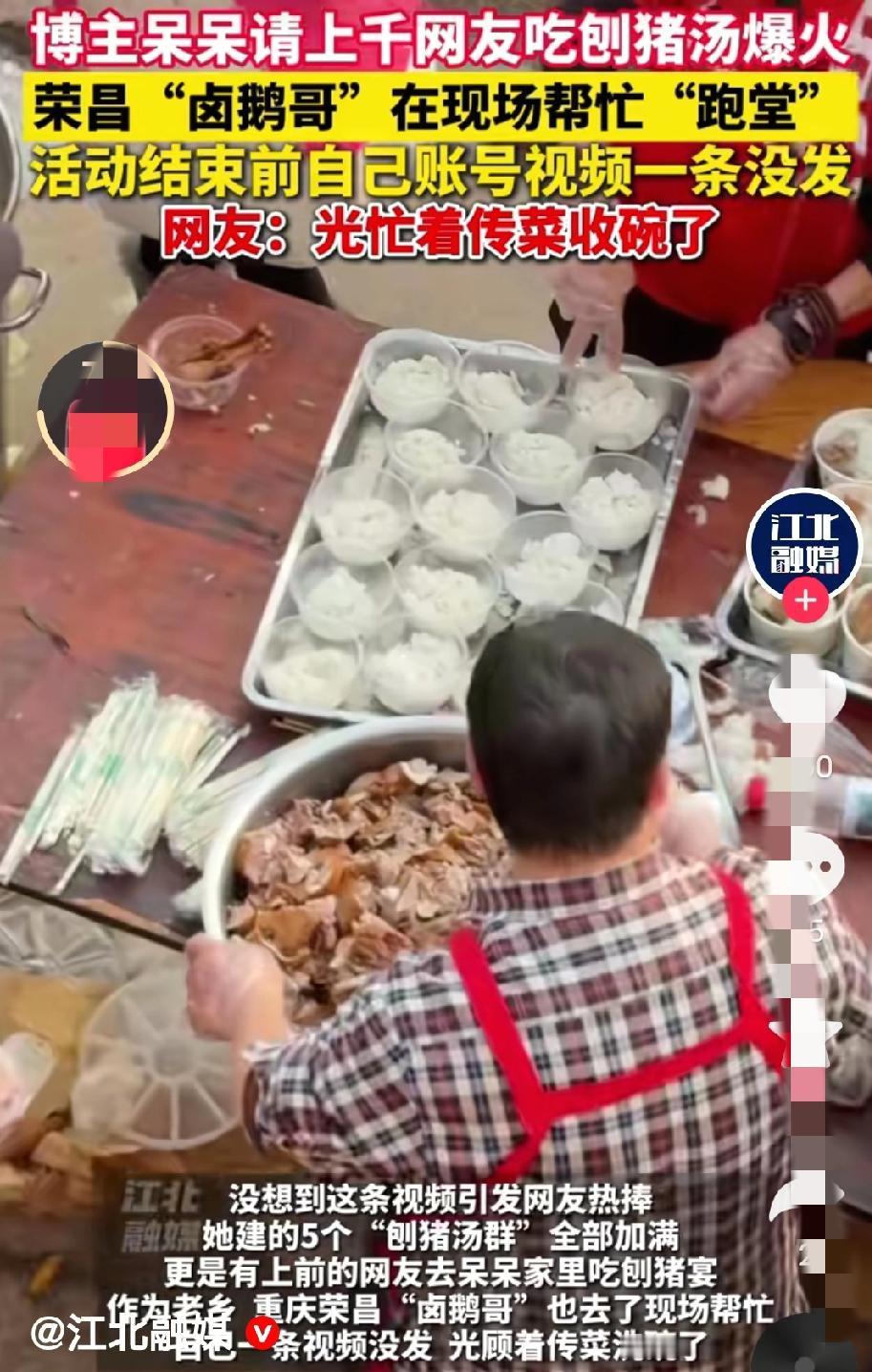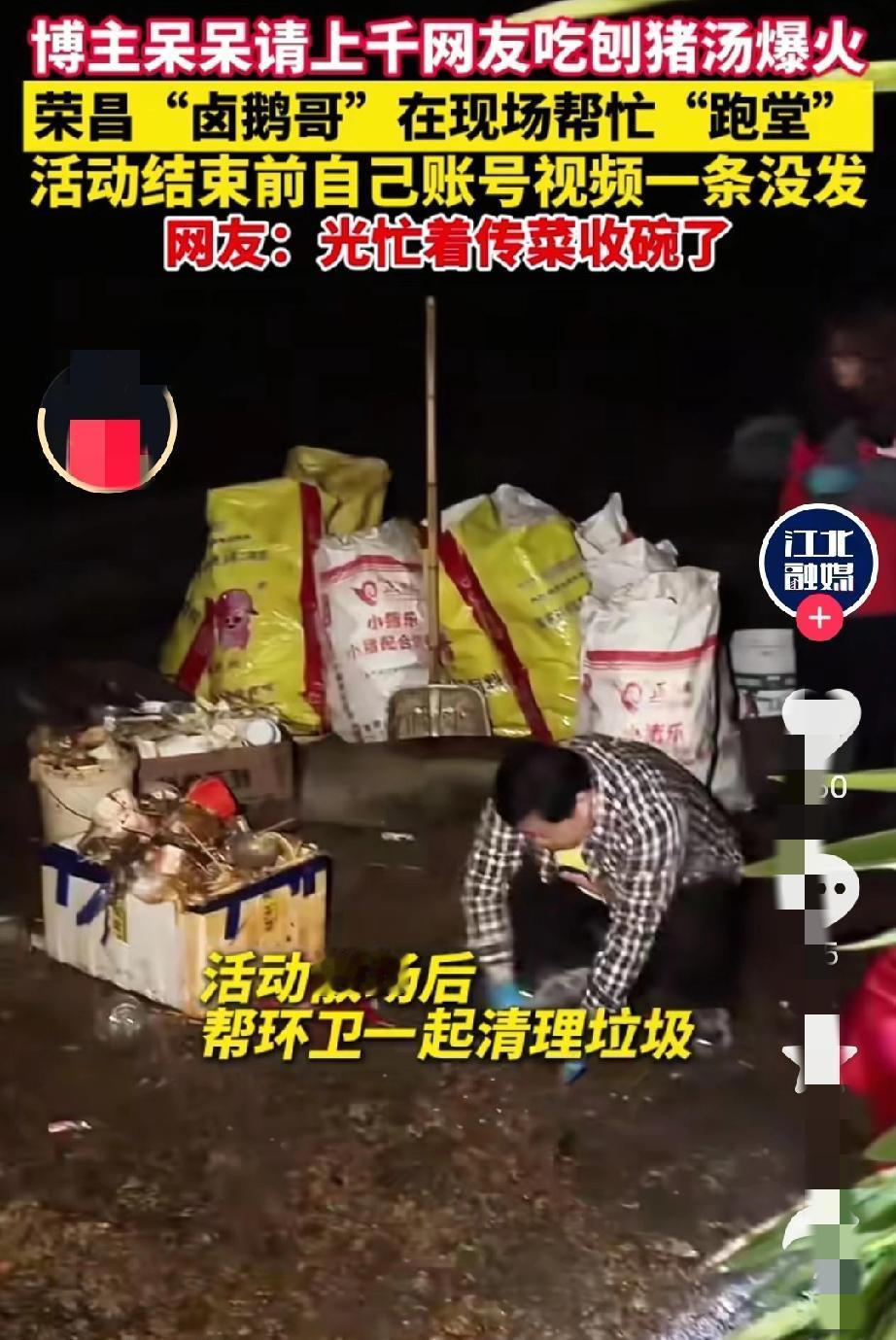 细节见人品!呆呆家的刨猪宴作为老乡的卤鹅哥也去了,这次他不是去蹭流量的,也不是去吃刨猪汤的,而是实实在的干活帮忙。就像平时给邻居帮忙一样,如果他不是网红,还以为是呆呆请来帮忙的人呢! 卤鹅哥去了现场后,把荣昌卤鹅推荐给了呆呆,然后,穿上围裙就像主人一样,自发的去忙活了起来,上菜,收碗,擦桌子… 其他人吃着,笑着,拍视频… 唯独他成了刨猪宴上最忙的人, 直到天黑,所有的人都走了,他又帮着环卫将垃圾清理掉,才离开。 原以为他也会拍点视频为自己做一下宣传,谁知,他太忙了,一条视频都没拍。 不过,这一切网友也看到眼里,大赞:支持卤鹅哥,不为名利,只做好自己! 这才是一个值得让人尊敬的网红, 毕竟,流量总会过去,热度总会降温,唯有这份实实在在的人品和沉甸甸的真心,才能让人走得长远。