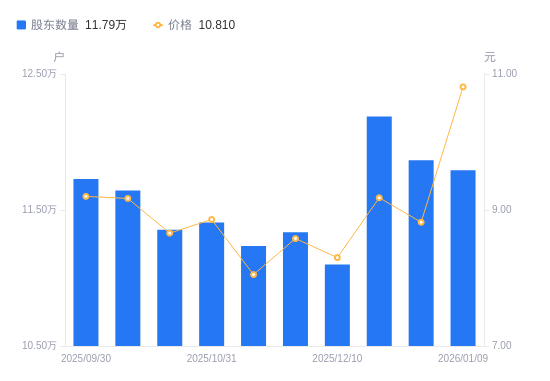 日期A股户数(户)流通A股户均持股数(股)户均持股市值(万元)2026-01-0911792415467.4216.722025-12-3111865115372.6513.562025-12-1912188315707.5714.422025-12-1011099117249.0214.322025-11-2811335616889.1414.492025-11-2011235917039.0113.722025-10-3111408016781.9614.872025-10-2011355016860.2914.602025-10-1011644116441.6815.082025-09-3011728016323.9715.02